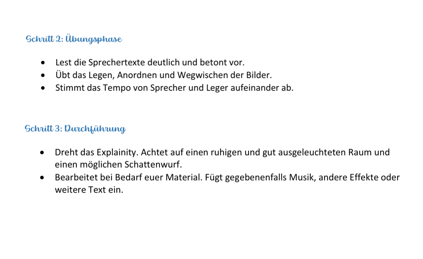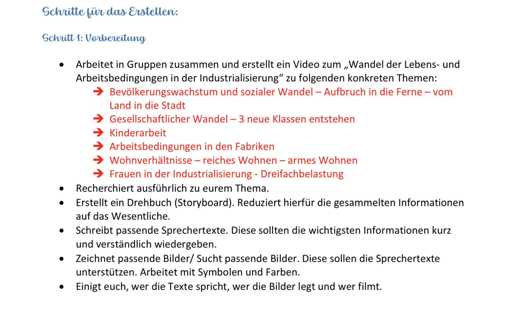 Wie bei allen anderen Arbeiten von Schülerinnen und Schülern ist es auch bei der Videoerstellung wichtig und sinnvoll, dass vorab ein Drehbuch / Storyboard erstellt sowie ein passender Sprechertext verfasst wird (siehe Arbeitsauftrag).