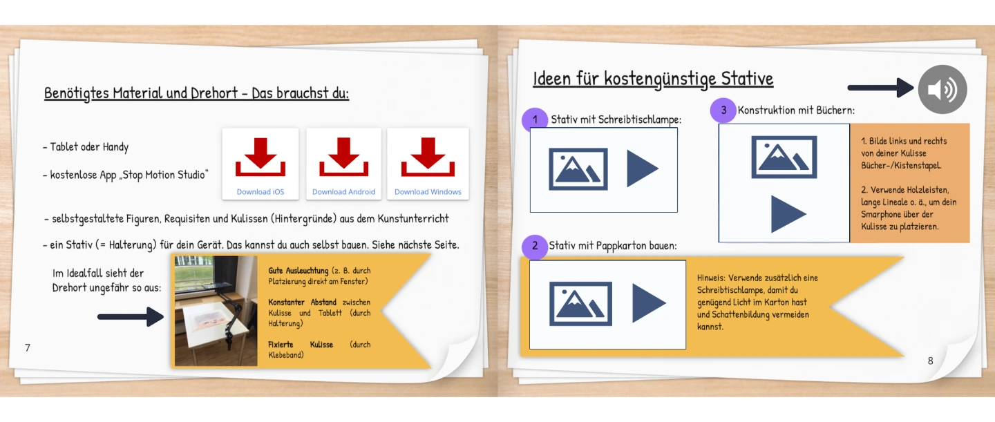 Die Gestaltung der notwendigen szenischen Mittel (Figuren etc.) ist sehr zeitintensiv. Es bietet sich an, diese in den Kunstunterricht auszulagern. Dadurch ergibt sich ein fächerübergreifendes Projekt. Im Kunstunterricht kann zudem eine gemeinsame Erarbeitung von Kriterien für die optische Aufmachung des Films und die damit verbundene Gestaltung der benötigten Materialien erfolgen.