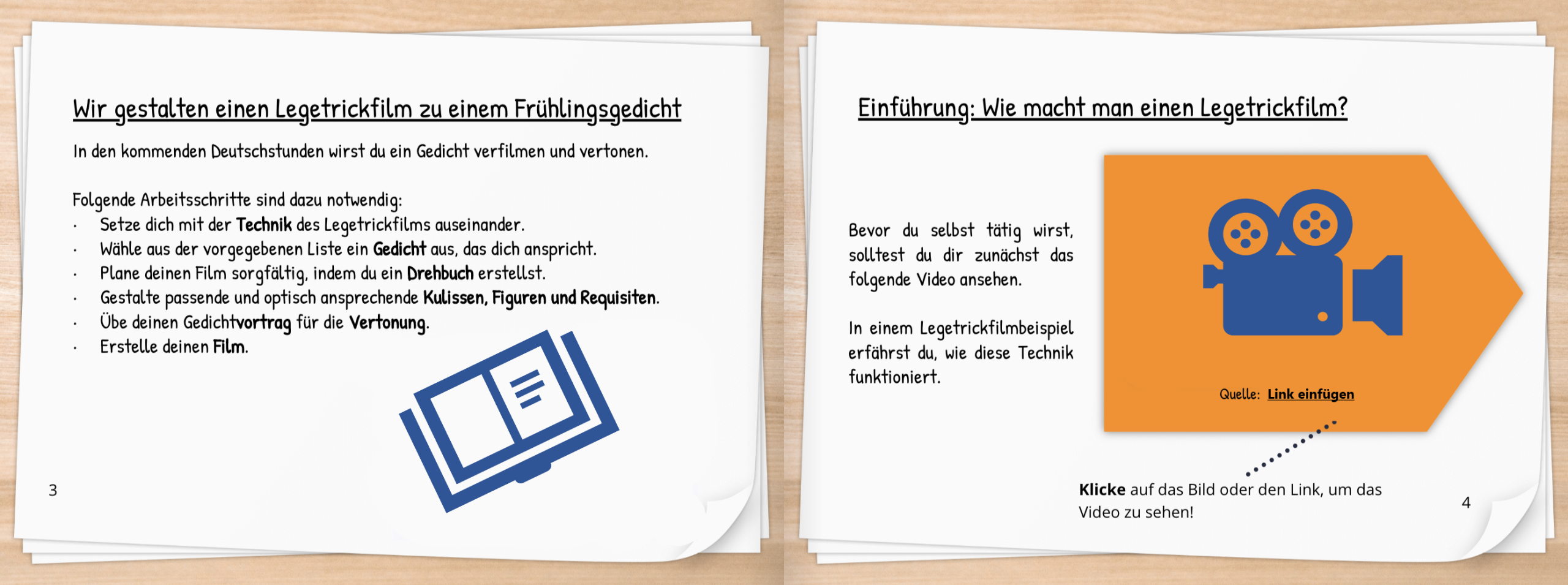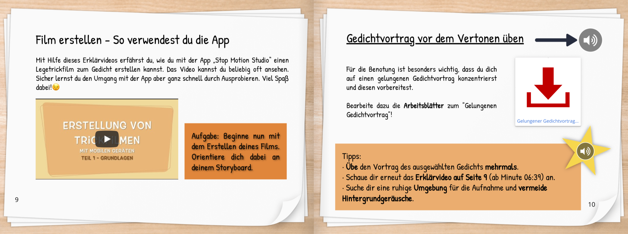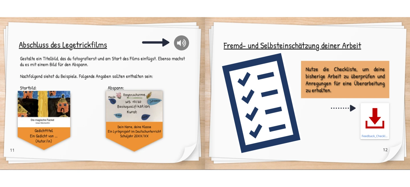 Die Lernenden erschließen dabei selbstständig den Inhalt des gewählten Gedichts, indem sie mittels Storyboard genau überlegen müssen, wie sie dieses in Form von eigens gestalteten Kulissen, Requisiten und Figuren visualisieren können. Neben der optisch ansprechenden Umsetzung der einzelnen Strophen steht ebenso eine gelungene Vortragsweise des Gedichts im Fokus, die vor einer finalen Vertonung thematisiert und eingeübt wird.