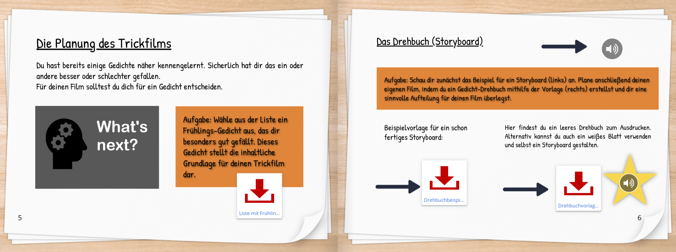 Aus einer vorgegebenen Liste wählen die Lernenden ein Frühlingsgedicht, das die inhaltliche Grundlage für ihren Legetrickfilm darstellt. Sie beginnen mit der Planung ihres Films, indem sie ein Drehbuch (Storyboard) erstellen.