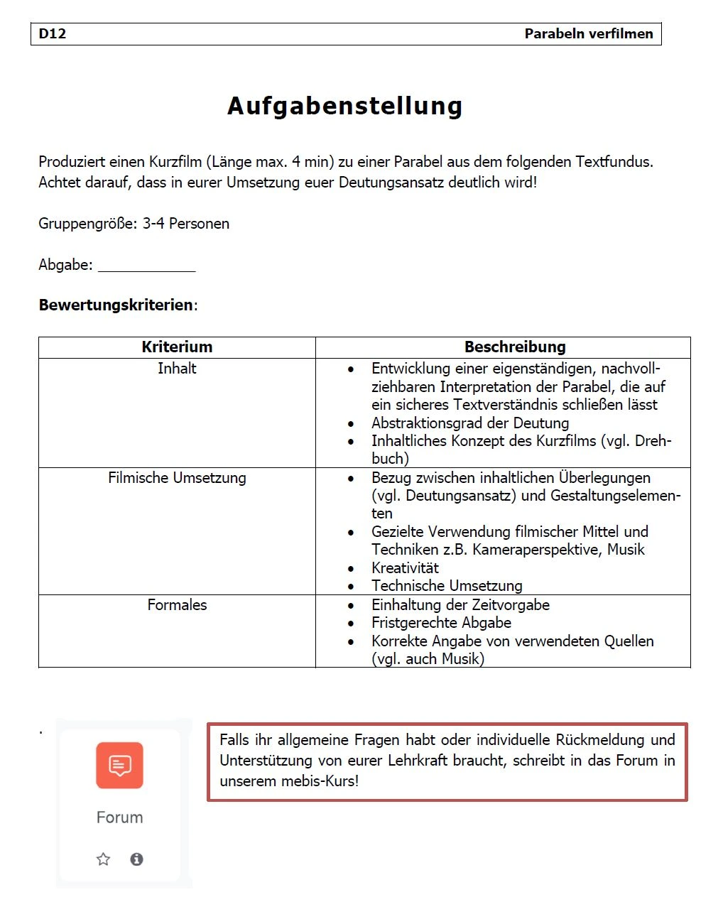Die Aufgabe, eine Parabel zu verfilmen, beinhaltet eine Transferaufgabe zur Vertiefung bereits erworbener Kompetenzen im Bereich „Lesen und mit Medien (vgl. Film) umgehen“. Die Lernenden wählen aus einem vorgegebenen Pool an Texten eine Parabel aus und erarbeiten anhand ihrer Auswahl sowohl die inhaltliche Konzeption als auch die Gestaltung und technische Umsetzung des Kurzfilms. Die Herausforderung besteht zunächst darin, als Grundlage für ein Textverständnis die Bildsprache des Textes aufzulösen und auf eine Deutungsebene zu übertragen.