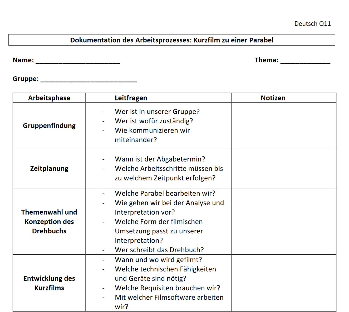 Als Anleitung und Unterstützungsmaterial bekommen die Schülerinnen und Schüler ein Arbeitsblatt mit Leitfragen zu den einzelnen Schritten des Arbeitsprozesses. Damit dokumentieren sie ihre Gruppenarbeit.