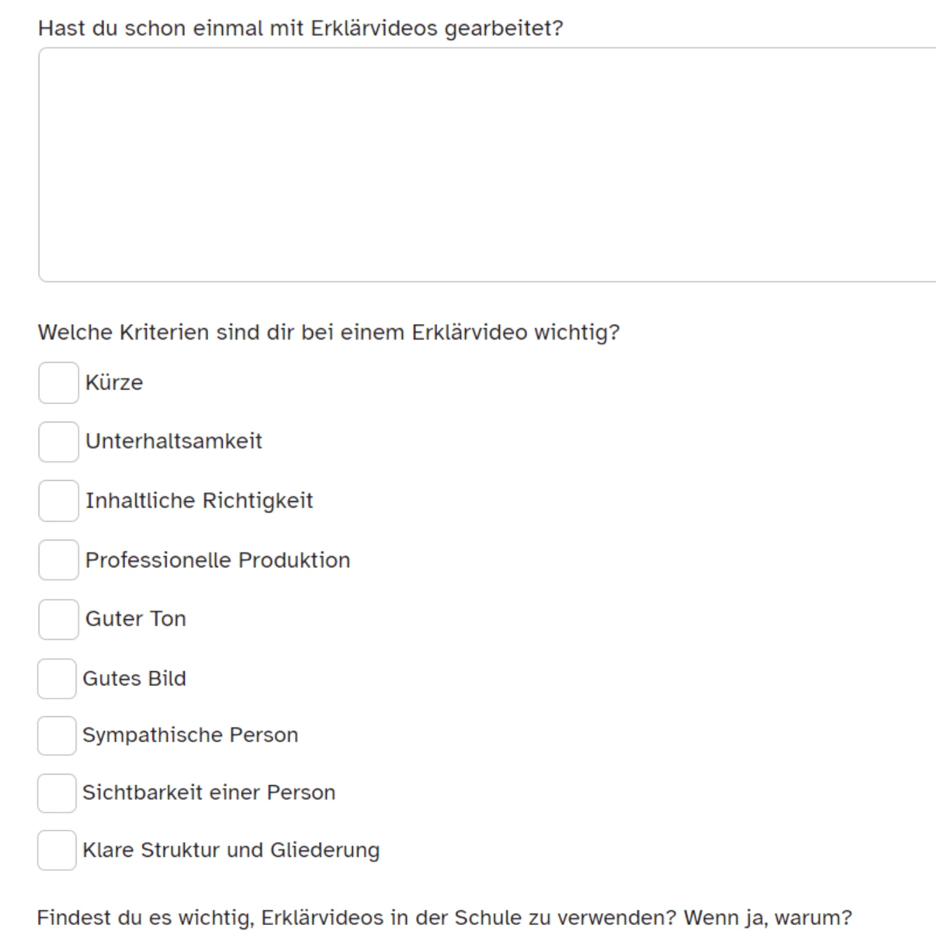 Die Unterrichtseinheit ist als mebis-Kurs konzipiert. Zu Beginn erhalten die Schülerinnen und Schüler den Auftrag, einzelne Videobeispiele anzuklicken und ihre Gedanken dazu zu notieren. Sie sollen überlegen, was ihnen an den Videos mehr oder weniger gelungen erscheint. In einem gemeinsamen Wiki werden daraufhin Kriterien für ein ansprechendes Erklärvideo gesammelt. Diese Sammlung dient wiederum zu einem späteren Zeitpunkt als Grundlage für einen durch die Lernenden selbst erstellten Feedbackbogen zur Beurteilung der entstandenen Filmproduktionen.