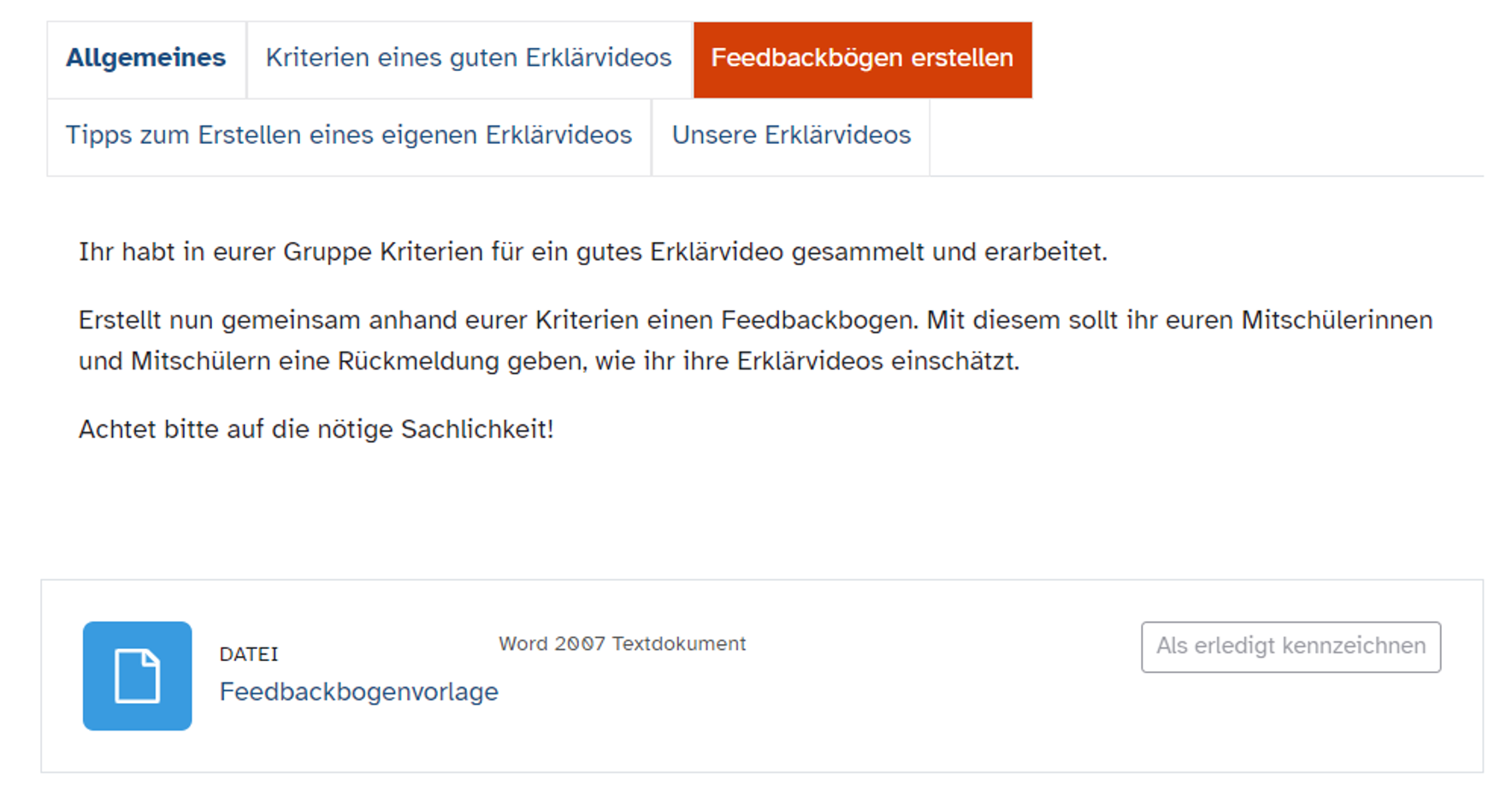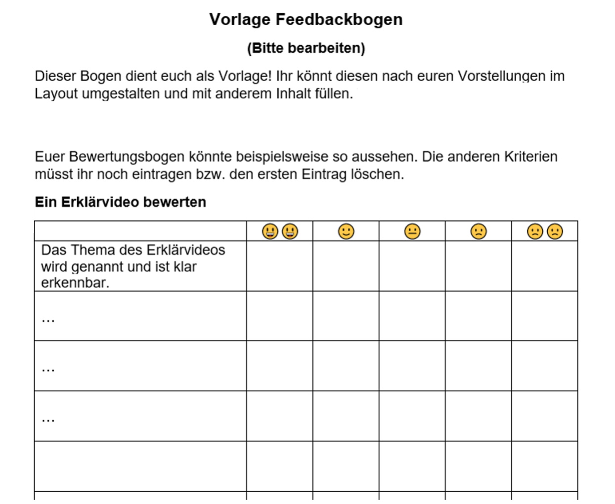 Die einzelnen Gruppen erstellen jeweils anhand der eingangs gesammelten Kriterien einen Feedbackbogen, mit welchem sie als sog. „Filmberater“ die Videos ihrer Mitlernenden bewerten und ihnen Rückmeldung zum bisherigen Produkt geben. Daraufhin erhalten die Gruppen die Möglichkeit, ihren Film bei Bedarf zu überarbeiten.