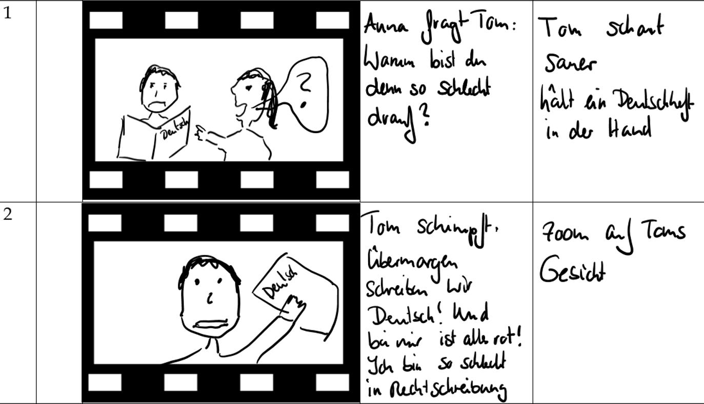 Damit erstellen die Gruppen ein Drehbuch, das die einzelnen Szenen, Perspektiven und die eingesprochenen Texte darlegt. Der Dreh erfolgt mit Hilfe von Tablets oder Handys im Rahmen einer Doppelstunde. Es muss darauf geachtet werden, dass genügend ruhige Räume für die Gruppen zum Drehen zur Verfügung stehen.