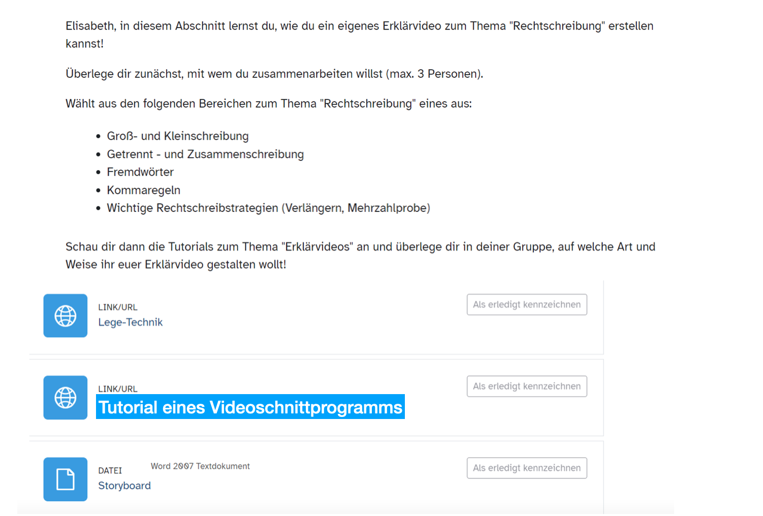 Die Schülerinnen und Schüler finden sich in einer Arbeitsgruppe zusammen, wählen aus fünf Vorschlägen zum Thema „Rechtschreibung“ eines aus und erarbeiten dazu passend ein Storyboard. Dabei treffen sie auch eine Entscheidung hinsichtlich der Umsetzung (Vlogging-Stil, Legetechnik etc.).