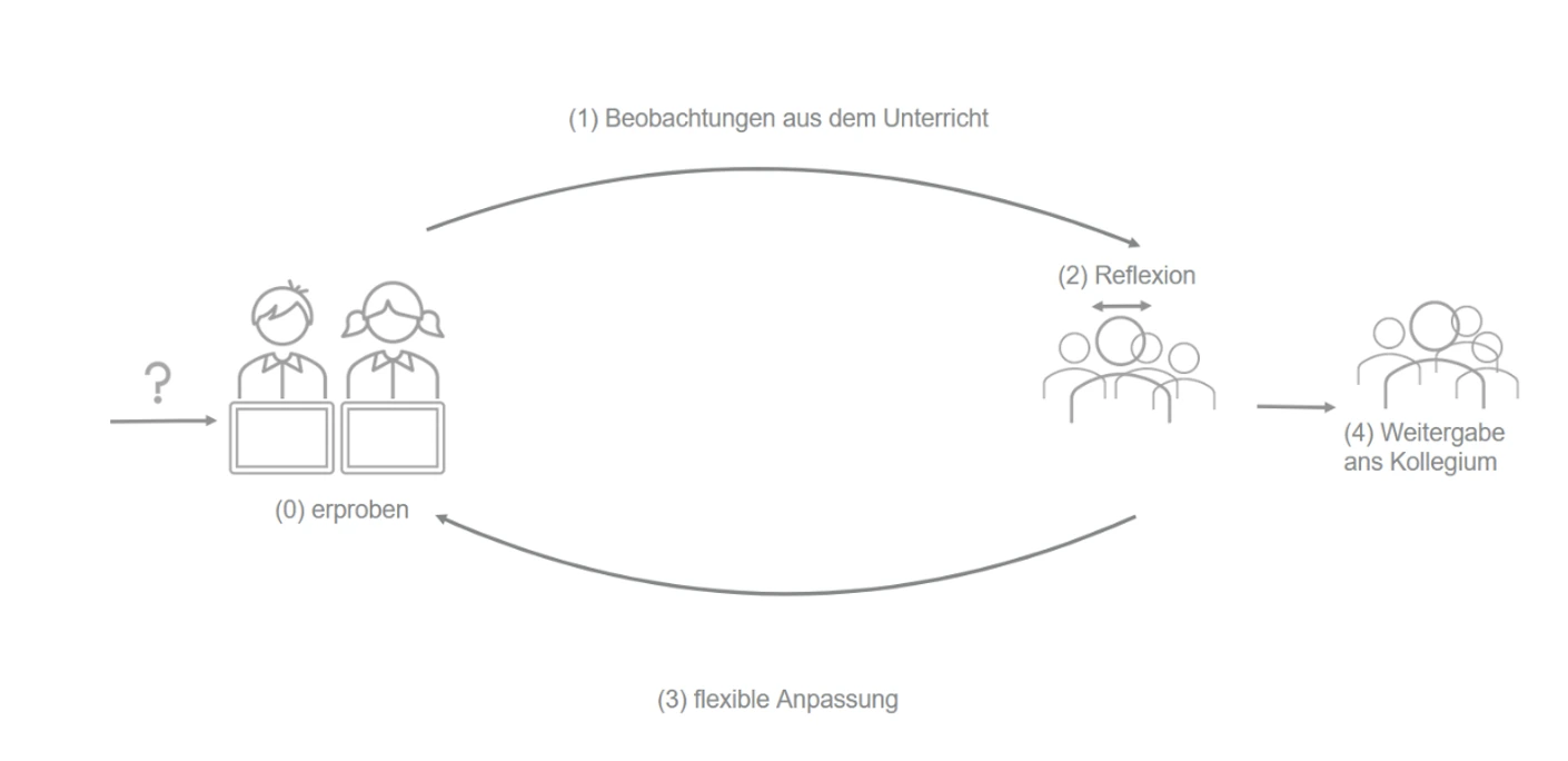 Im Sinne der Lernenden lohnt es sich, den Einsatz gemeinsam im Kollegium abzustimmen, Erfahrungen zu sammeln und gemeinsam Konzepte zu entwickeln. Nach einer Standortanalyse und der Formulierung eines gemeinsamen Ziels, müssen sich die Steuergruppe fragen, wie sie dieses erreichen können.