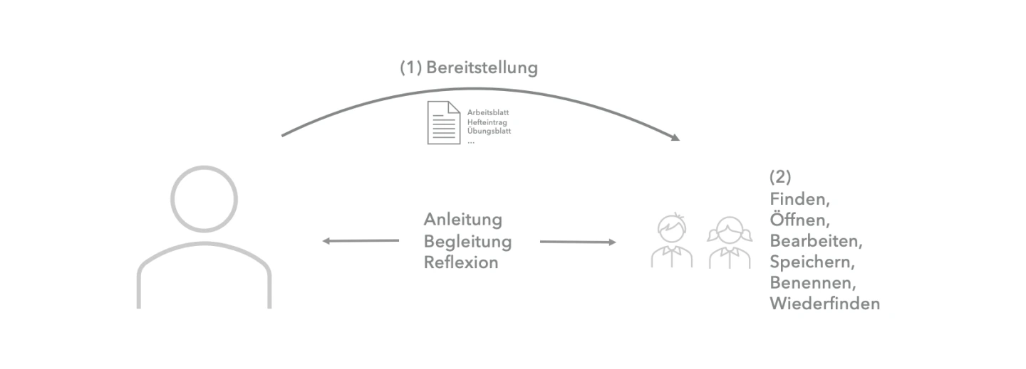 Wenn es keine einheitlichen Vorgaben von der Schule gibt, ist es sinnvoll, seine Erwartungen an die Lernenden bezüglich des Workflows sowohl den Lernenden als auch den Erziehungsberechtigten mitzuteilen und zum Beispiel in Form von entsprechenden Hausaufgaben zu üben. Ein Schulungskonzept erleichtert den Einstieg, die Nutzung sollte aber nach wie vor angeleitet werden, insbesondere, wenn jede Lehrkraft eigene Strukturen verwendet.