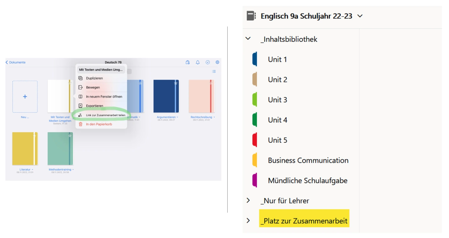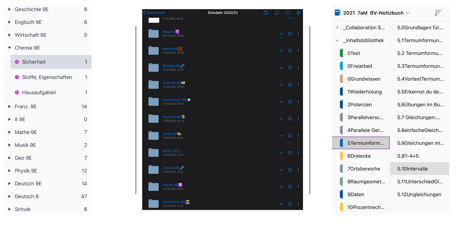 „Damit unsere Lehrkräfte für alle Jahrgangsstufen die digitale Heftstruktur im jeweiligen Fach möglichst einheitlich anlegen, haben wir ein Vorlagen-System dafür eingeführt. Zu Beginn des Schuljahres in der ersten Lehrerkonferenz sowie in den kurz darauffolgenden Fachschaftssitzungen wird fachspezifisch eine beispielhafte Vorlage der digitalen Heftführung vorgestellt. Die Lehrer sollen diese möglichst übernehmen, um eine alle Jahrgangsstufen übergreifende Struktur zu schaffen und somit sowohl den Lehrenden als auch den Lernenden die Handhabung über die Schuljahre hinweg zu erleichtern (Realschule Kösching).”