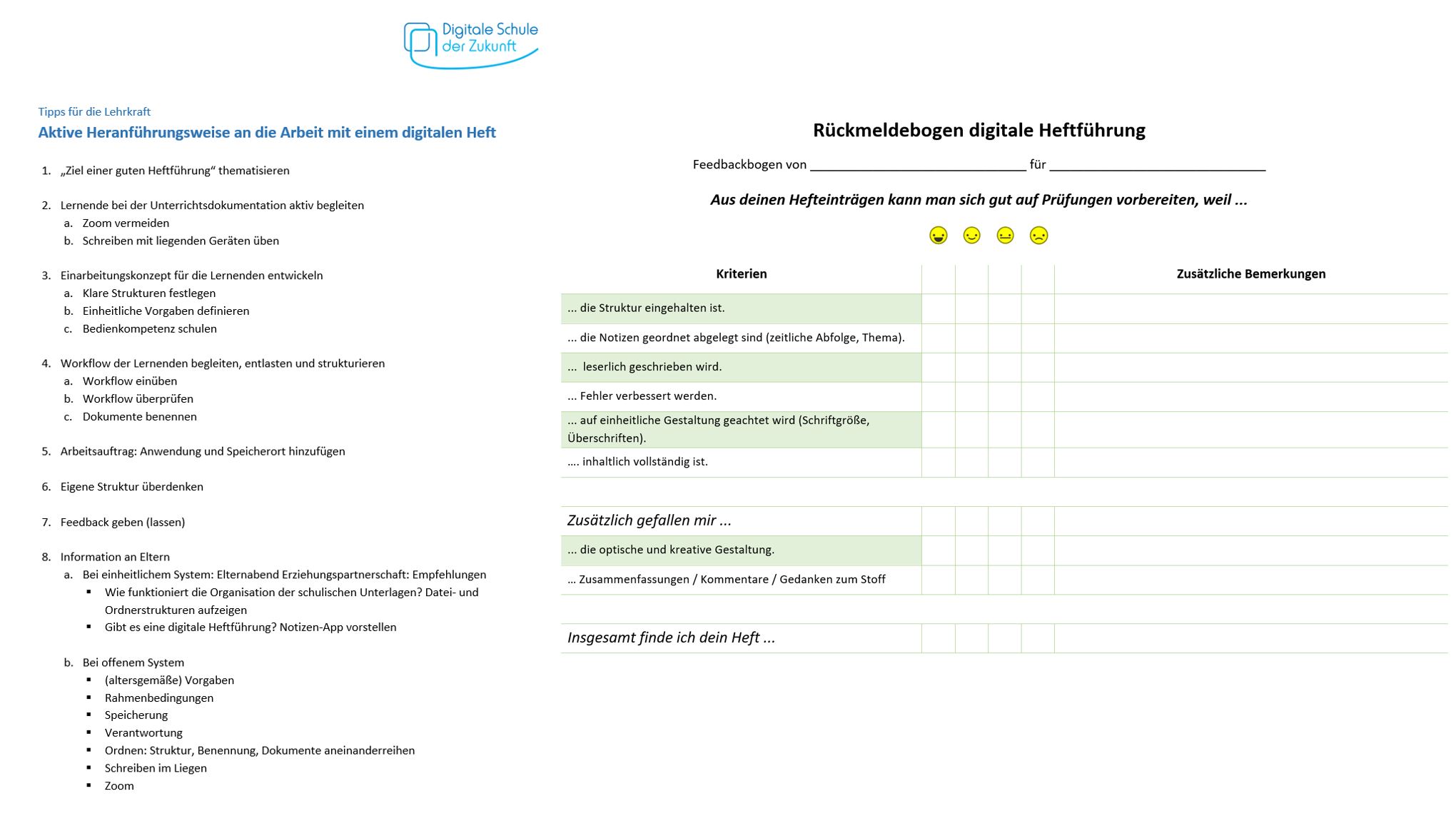 Für die Nutzung des digitalen Hefts sollten auch, abhängig von der gewählten Umsetzungsvariante, klare Vorgaben erarbeitet und an die Lernenden sowie Erziehungsberechtigten kommuniziert werden. Diese müssen an pädagogische, didaktische und fachspezifische Bedürfnisse angepasst werden.