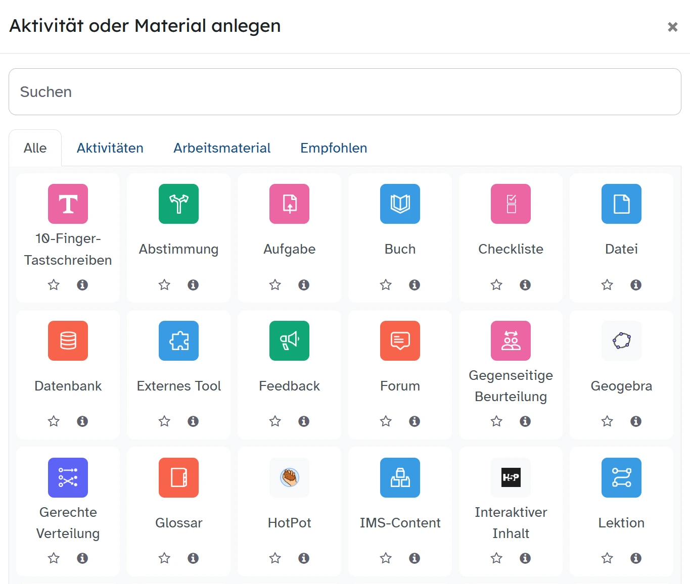 Kursräume in der Lernplattform bieten Ihnen die Möglichkeit, Lernarrangements zu entwickeln, in denen Lernende auch zeit- und ortsunabhängig selbstgesteuert oder kollaborativ arbeiten können. Dazu steht Ihnen eine Vielzahl an Aktivitäten und Materialien bereit, die Sie nach den Bedürfnissen Ihrer Lerngruppe einsetzen können. Innerhalb Ihrer Kurse können Sie und die Lernenden auch untereinander in Kontakt treten und zusammenarbeiten.