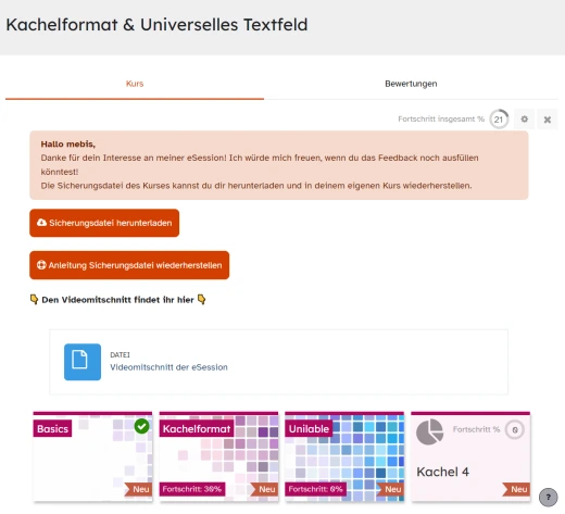 Die mebis Lernplattform bietet viele Gestaltungsmöglichkeiten für Ihre Kursräume. Schon bevor Lernende sich mit den Inhalten beschäftigen, erhalten sie einen ersten visuellen Eindruck von einem Kurs. Die Kursgestaltung kann sich maßgeblich auf die Motivation auswirken – und damit auch auf die Lernwirksamkeit. Optimalerweise gelingt es Ihnen, schon über die Gestaltung eine positive Einstellung bei Lernenden zu erzeugen.
