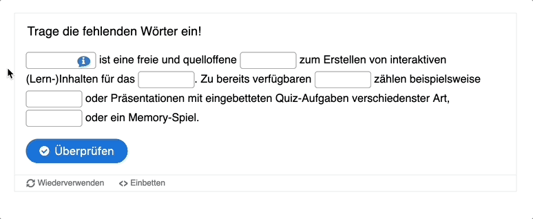 In der Lernplattform können Sie u. a. mit der Aktivität „H5P – interaktive Inhalte“ ansprechende und lernförderliche interaktive Aufgaben erstellen. Gestalten Sie interaktive Videos oder anschauliche Graphiken – vom einfachen Lückentext bis hin zum aufwendigen 360-Grad-Bild ist alles möglich.