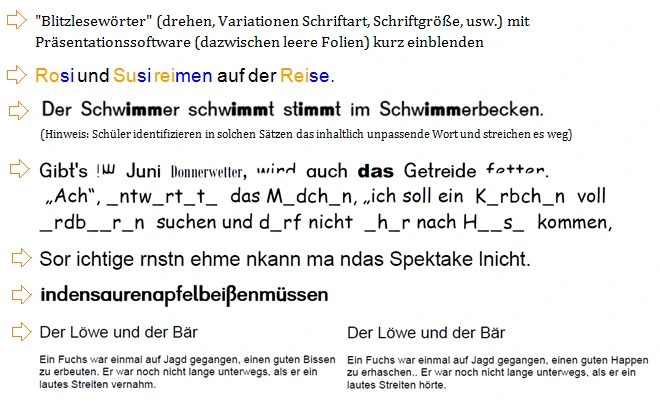 Auch „kleine“ Leselernübungen (Blickspannerweiterung durch Blitzlesen, Silben lesen, Signalgruppen / Morphemtraining, erschwertes Lesen, genaues Lesen u.v.m.) lassen sich digital mit einfachen Mitteln umsetzen.