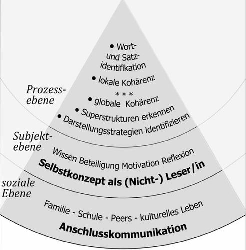 Während das Kompetenzmodell von PISA z.B. eher einen engeren Leseleistungsbegriff zugrunde legt, um Lesekompetenz messen zu können, ist das Mehrebenen-Modell von Rosebrock/Nix didaktisch relevanter. Es untergliedert sich in die 3 Ebenen Prozess-, Subjekt- und soziale Ebene. Auf der Prozessebene, die bei der Leseförderung an Schulen entscheidend ist, findet eine Hierarchisierung statt: