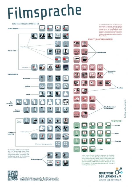 Zusätzlich zum interaktiven Plakat im Online-Material kann ein Papier-Poster im Klassenzimmer das Sprechen über Filmanalyse visuell unterstützen. Das gedruckte Filmsprache-Plakat ist für bayerische Schulen kostenlos erhältlich bei: