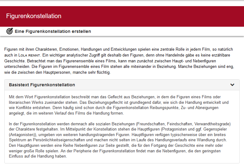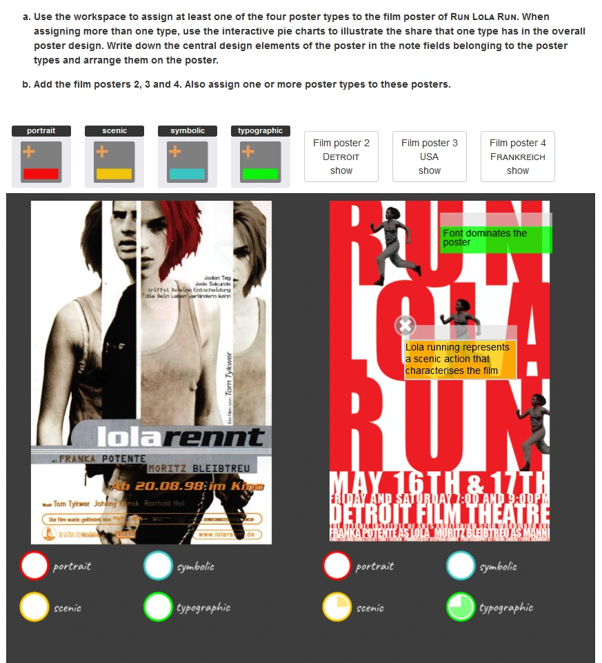 Fachsystematisch: Über sogenannte „Marker“ sind Verlinkungen der selbstgewählten Screenshots oder Filmsequenzen auf Erläuterungen zu den filmsprachlichen Mitteln (interaktives Filmplakat, Glossar etc.) möglich.