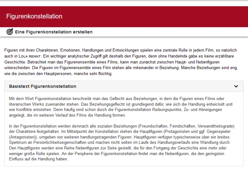 Das Lernpaket richtet sich an Lehrkräfte, die Filmanalyse sowie Grundlagen des filmischen Erzählens allgemein oder die Analyse des Films „Lola rennt“ im Speziellen vermitteln wollen. Die Lerneinheiten sind besonders geeignet für den Einsatz in den Fächern Deutsch, Religion, Kunst, Musik und Philosophie bzw. für die Filmbildung als fächerübergreifendes Anliegen.
