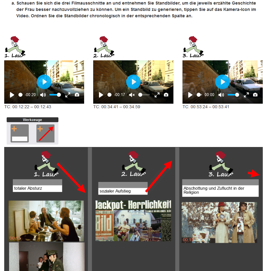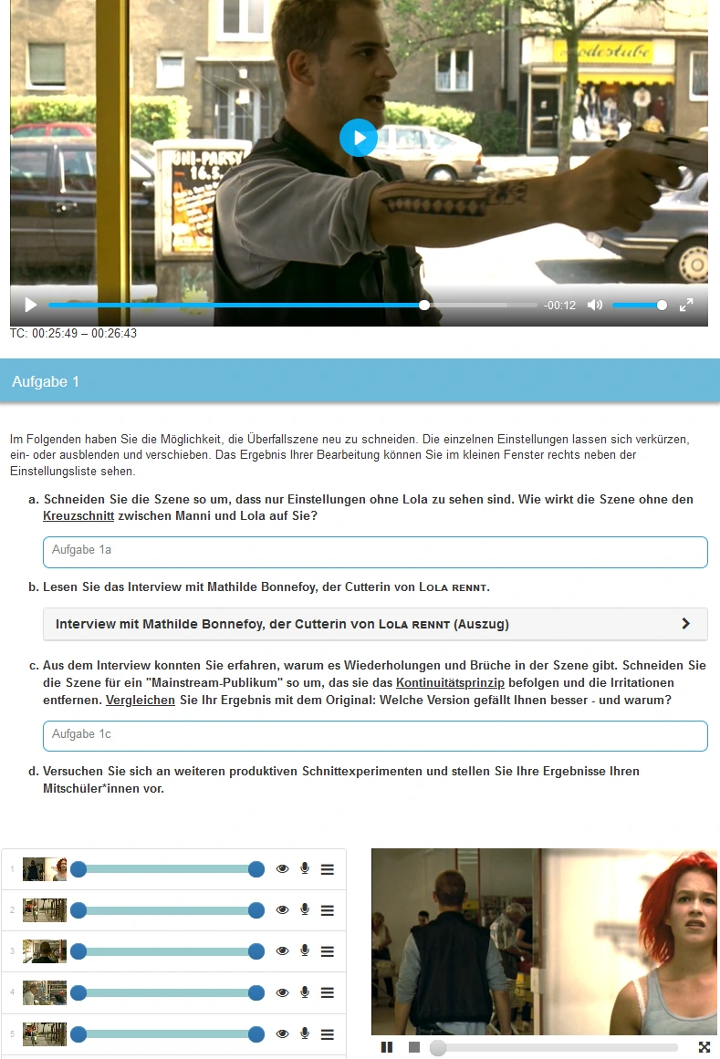 Die Aufgaben sind angelehnt an das Modell des pre- / while- / post-viewing aufgebaut. Durch die Kennzeichnung mit diesen Begriffen wird sofort klar, für welche Aspekte nicht die Kenntnis des gesamten Films erforderlich ist. Die Bearbeitungstools ermöglichen es, Filmausschnitte Frame für Frame zu durchforsten, Standbilder oder Filmsequenzen auszuwählen und diese zu grafisch, in Textform oder mit Markern zu annotieren.