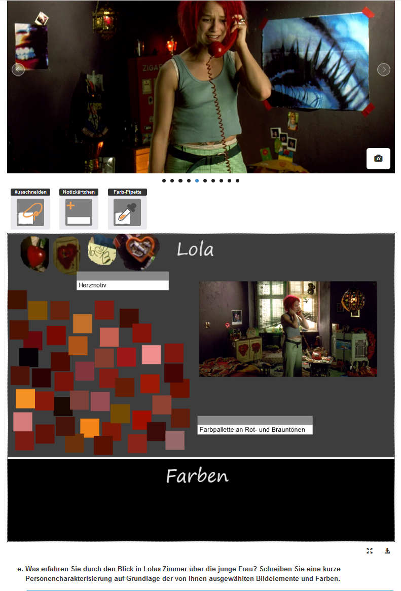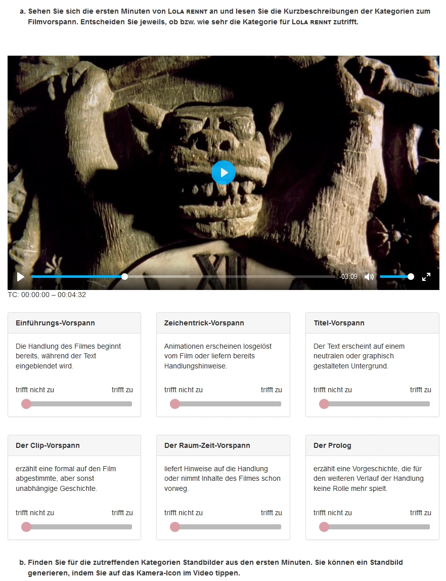 Die Teilaufgabe b. (Screenshot) verdeutlicht diese offene Gestaltung vieler Lernaufgaben, bei denen die Lernenden komplett frei ein Standbild aus einer Filmszene wählen.