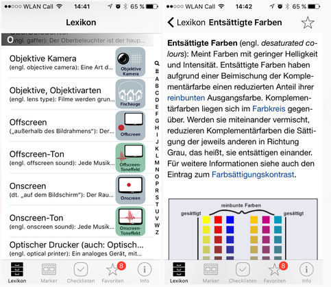 Die kostenlose App „Filmsprache“ umfasst ein umfangreiches Lexikon zur Filmsprache. Diese App ist unter dem Titel „The Language of Film“ auch in englischer Sprache erhältlich.