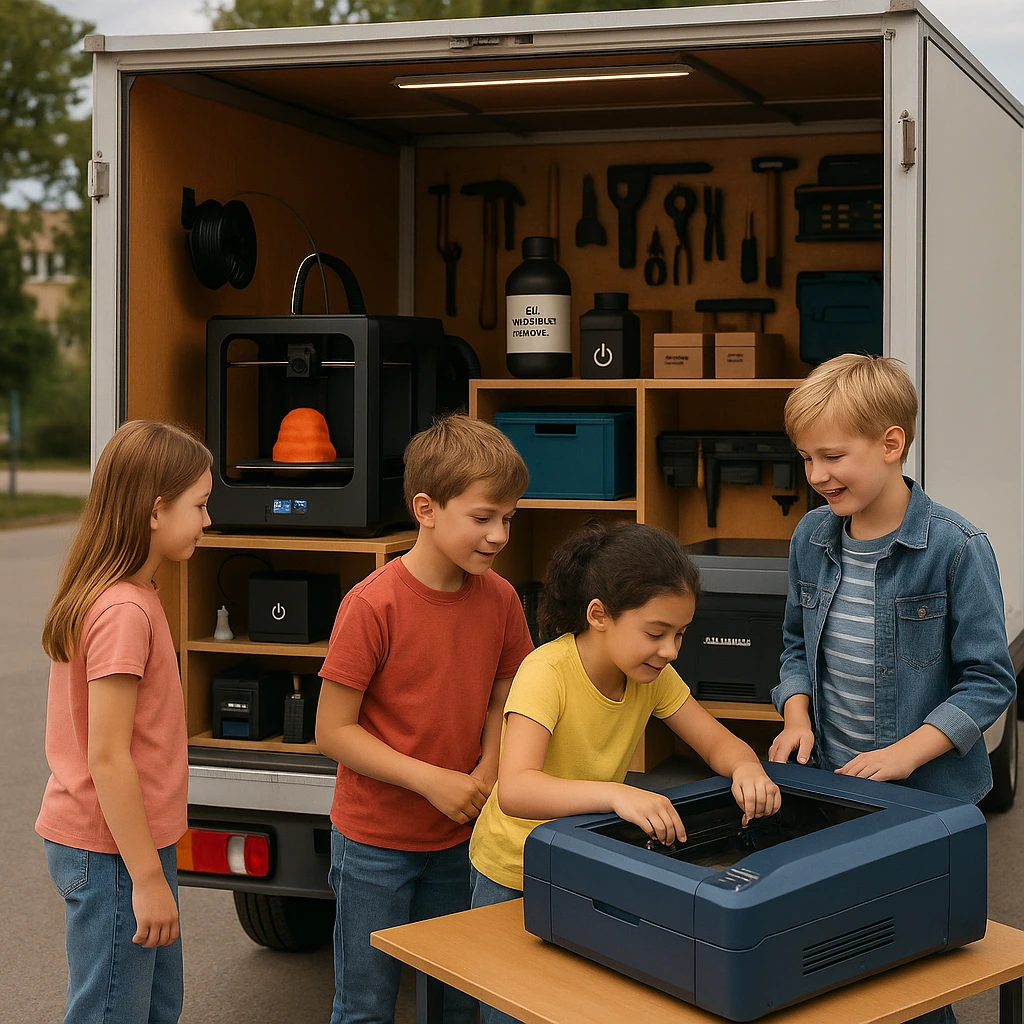 Mobile Makerspaces sind verbaut in speziellen Fahrzeugen, die direkt zu Schulen kommen und dort moderne Technik wie 3D-Drucker und Lasercutter für die Schülerinnen und Schüler bereithalten. Ein Beispiel dafür sind die M+E Trucks, in denen Jugendliche an exemplarischen Arbeitsplätzen technische Zusammenhänge aus MINT-Berufsfeldern praxisnah erleben, indem sie zum Beispiel eine CNC-Fräsmaschine programmieren oder die Funktion intelligenter IT-Steuerung an einem Aufzugmodell verstehen – alles begleitet von interaktiven Aufgaben auf Tablets.