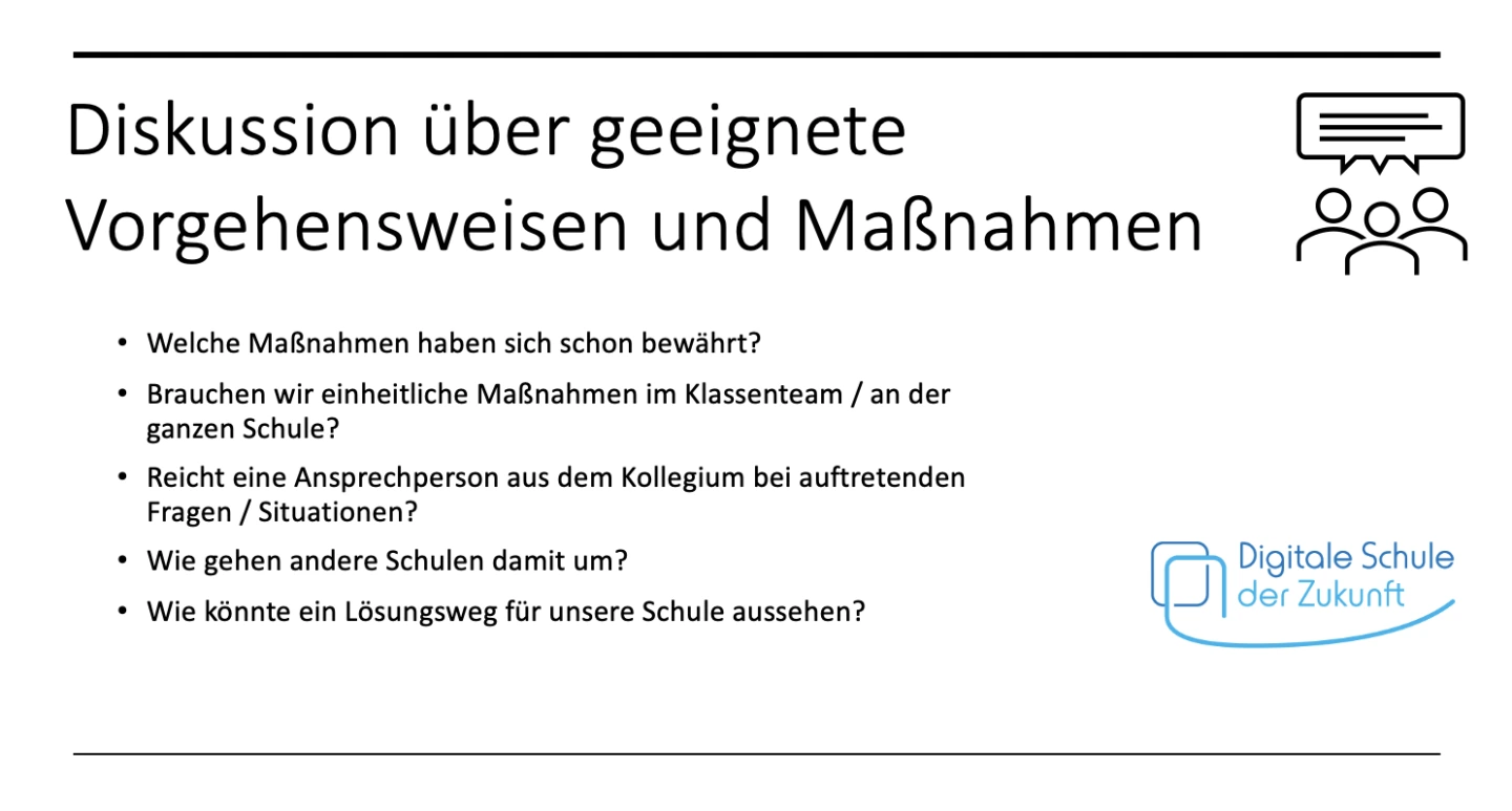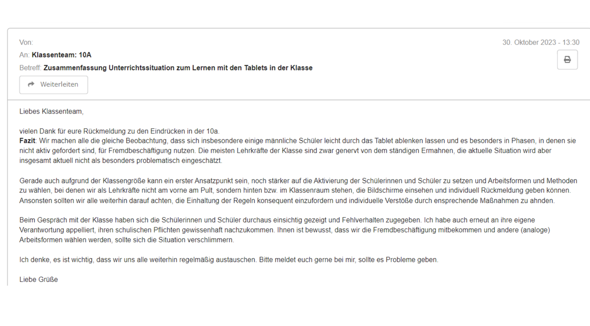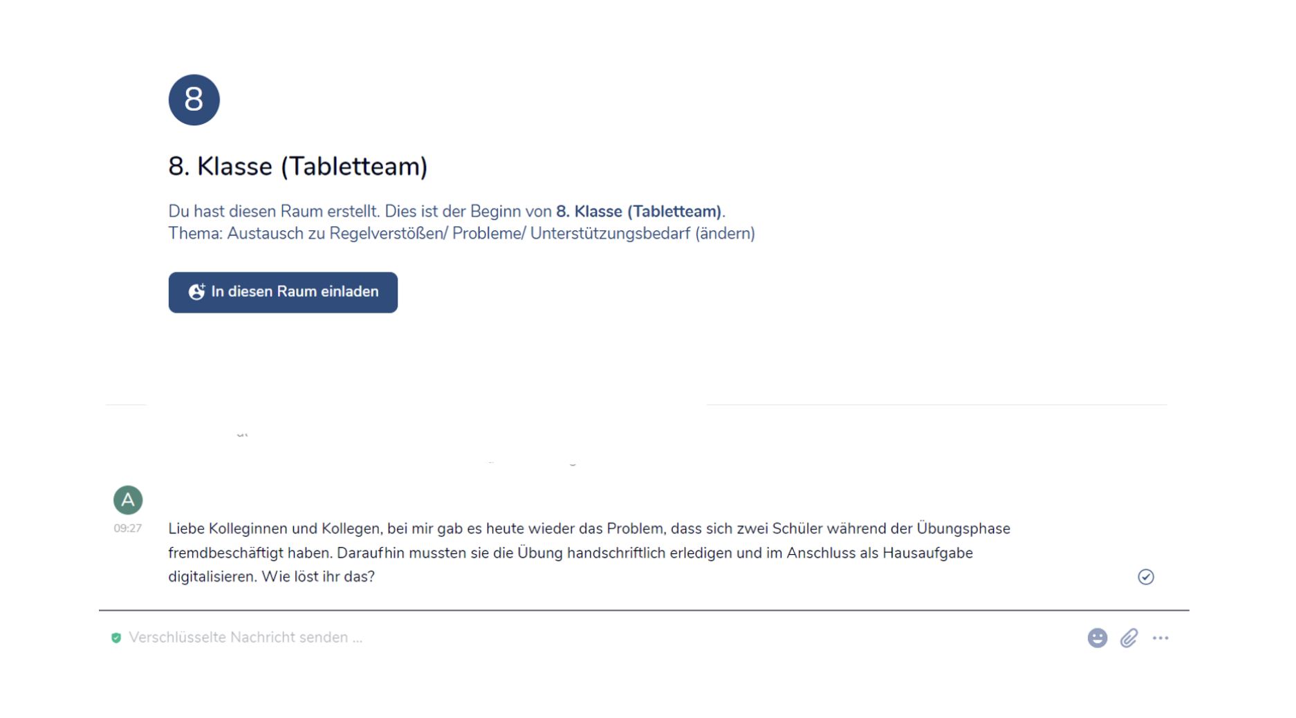 Des Weiteren ist es möglich, Konsequenzen bei Verstößen im Klassenteam abzusprechen. Dazu ist es notwendig, dass man sich über einen möglichst einfachen Kanal verständigt, wie man sich schnell und unkompliziert über aktuelle Vorkommnisse in den Klassen austauschen kann.