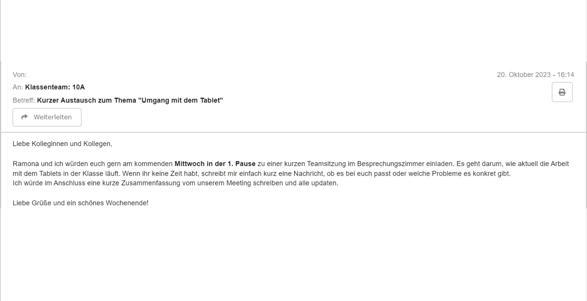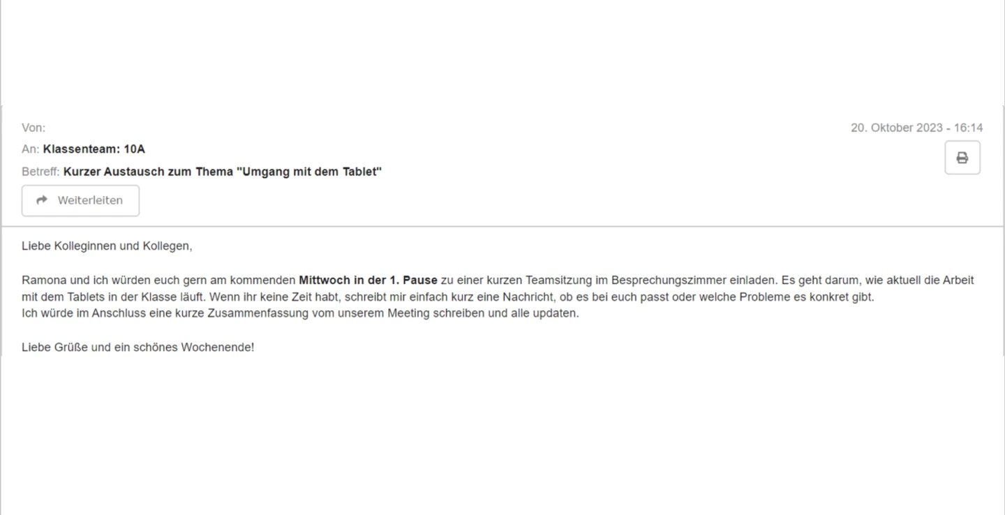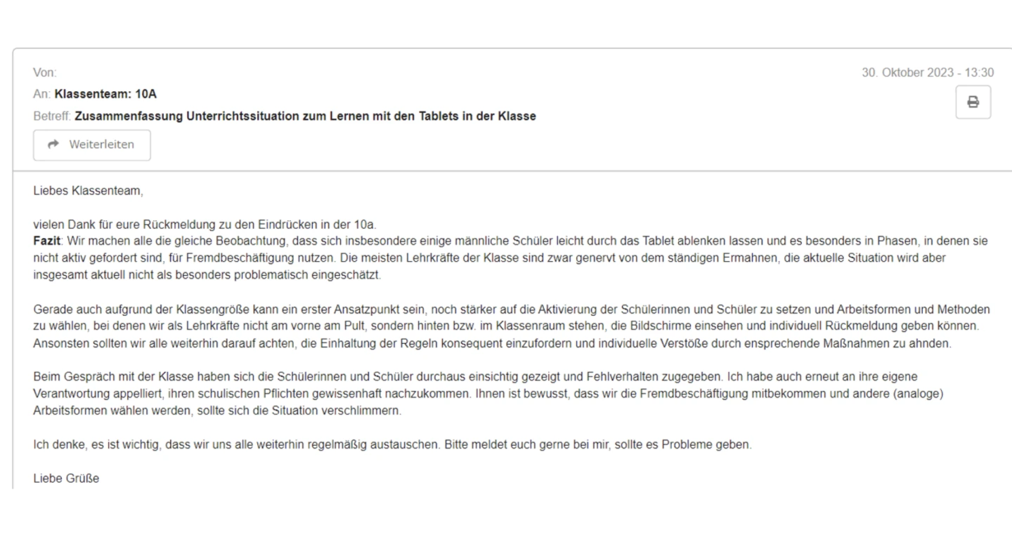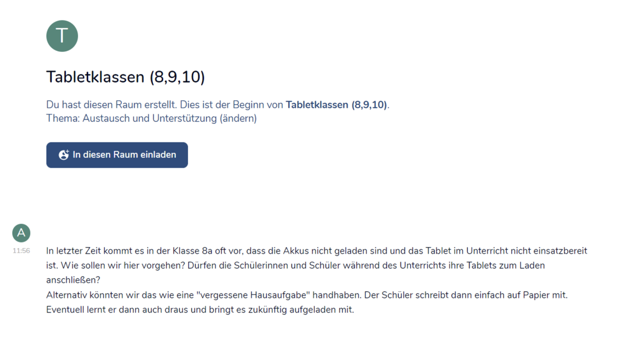Des Weiteren ist es möglich, Konsequenzen bei Verstößen im Klassenteam abzusprechen. Dazu ist es notwendig, dass man sich über einen möglichst einfachen Kanal verständigt, wie man sich schnell und unkompliziert über aktuelle Vorkommnisse in den Klassen austauschen kann.