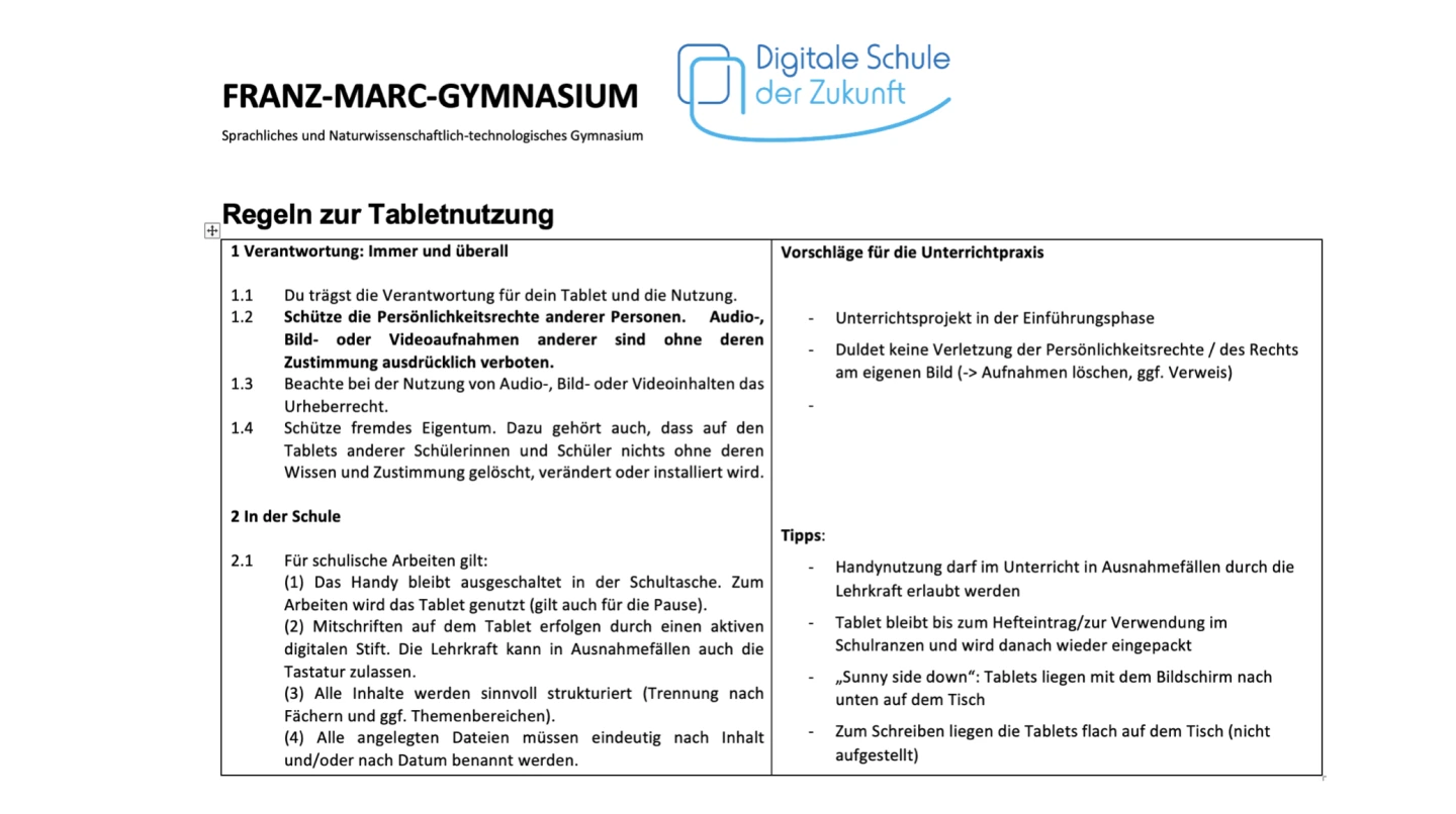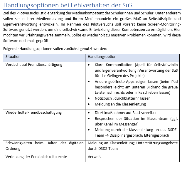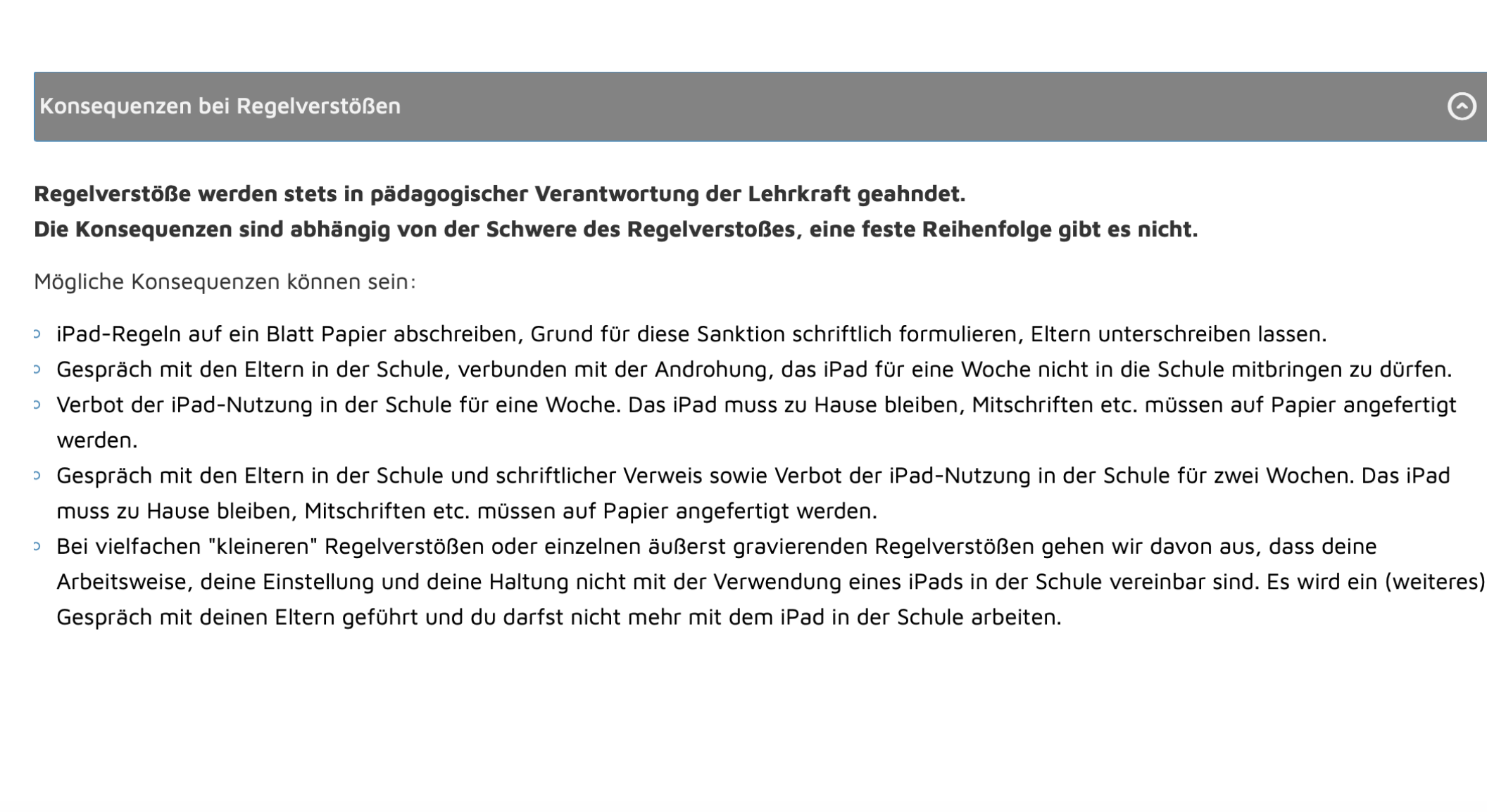 Regelverstöße wird es immer geben, da die Möglichkeiten, die Tablets bieten, für Lernende zu verlockend sind, um sie nicht ausprobieren zu wollen. Daher ist es wichtig, innerhalb der Schulgemeinschaft über Interventionsmaßnahmen und der Intensität deren Regulierung Absprachen zu treffen. An manchen Schulen / Schularten kann es daher notwendig sein, einheitliche Regelverstoß-Kataloge zu etablieren, während dies an anderen wiederum kontraproduktiv wirken kann. Welchen Grad der Regulierung sich eine Schule wünscht, hängt von verschiedenen Bedürfnissen und Gegebenheiten ab und sollte im Vorfeld gemeinsam festgelegt werden, zum Beispiel im Rahmen der Lehrkräfteschulung. In jedem Fall ist es aber notwendig, den Lehrkräften einen Überblick über die rechtlichen Grundlagen im Umgang mit den privaten Geräten zu vermitteln.