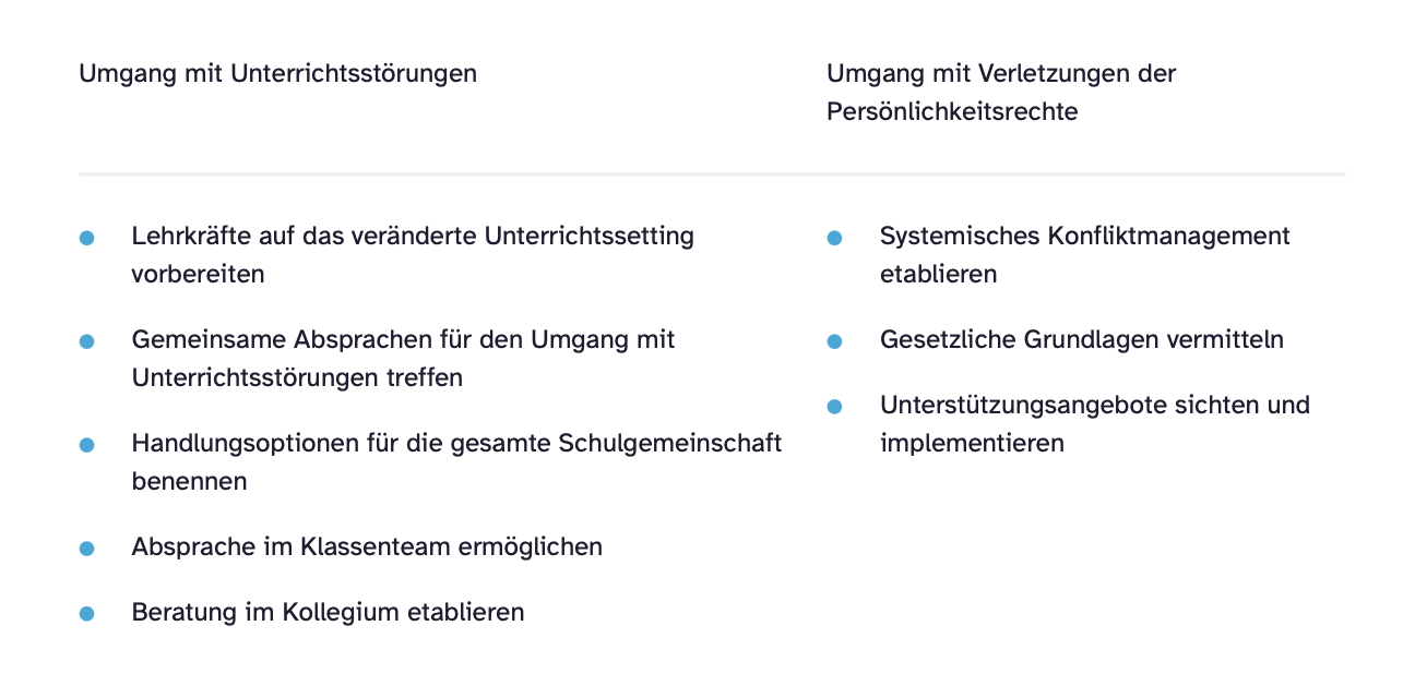 Schulen brauchen deshalb ein institutionell verankertes Konfliktmanagement, das Klarheit und Souveränität sowie einen professionellen Umgang mit Situationen wie übler Nachrede im Netz, (Cyber-)Mobbing und allen anderen Gefahren im Netz gewährleistet.