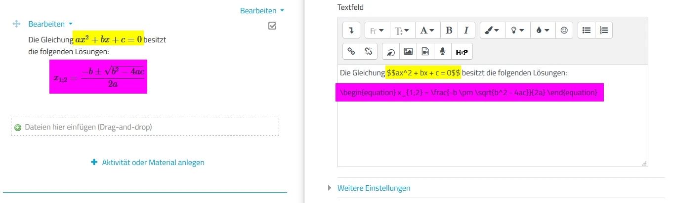 Im Texteditor der mebis-Lernplattform können an jeder Stelle Formeln eingegeben werden. Dazu muss der LaTeX-Befehlssatz lediglich innerhalb von je zwei Dollarzeichen $ eingebettet werden, also $$ ... $$. Derartige Formeln werden innerhalb des Textflusses dargestellt.