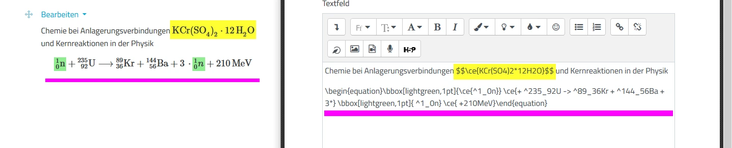 MathJax beherrscht ebenso den Chemieformelsatz.Das Plug-In nutzt die Erweiterung mhchem um auf einfache Weise chemische Formeln aber auch physikalische Kernreaktionen sauber darzustellen.