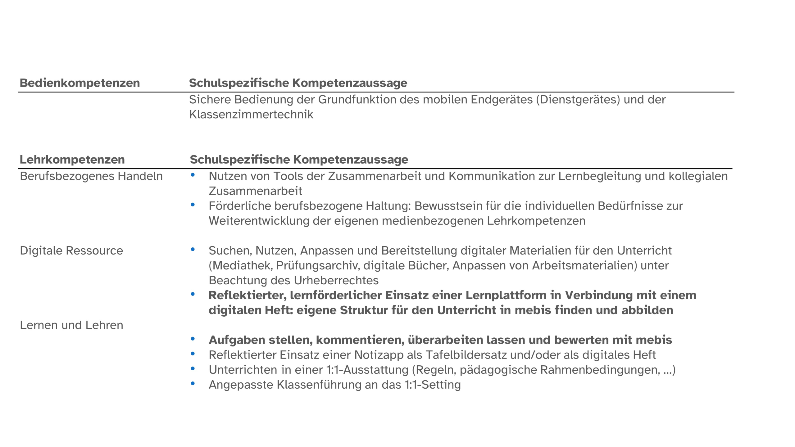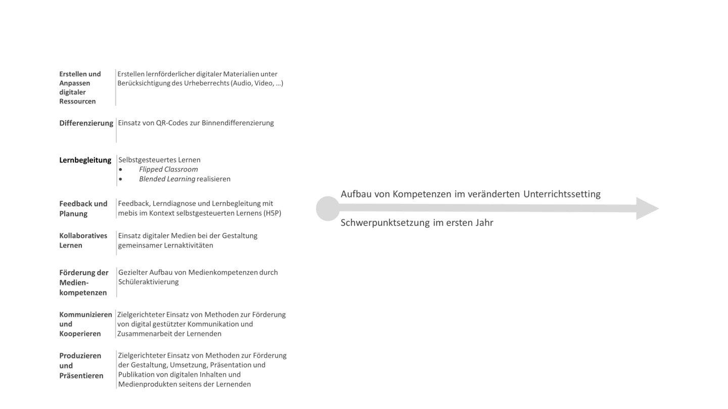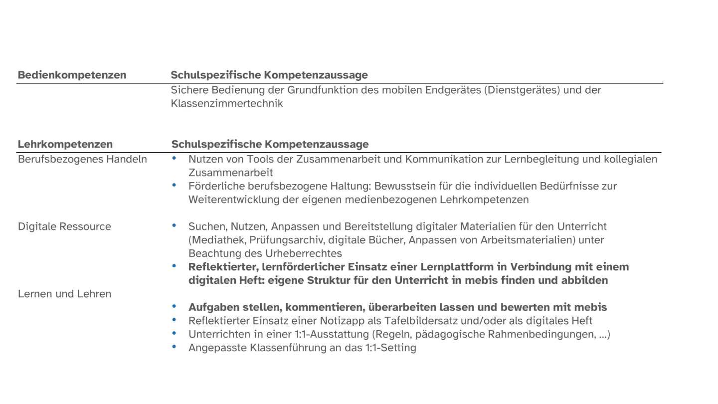 Ausgangspunkt für unsere an die 1:1-Ausstattung angepasste schulinterne Fortbildungsplanung war die Definition grundlegender Kompetenzen, die unsere Lehrkräfte zum Einstieg benötigen bzw. im Lauf der Jahre erwerben sollen. Dies soll helfen,