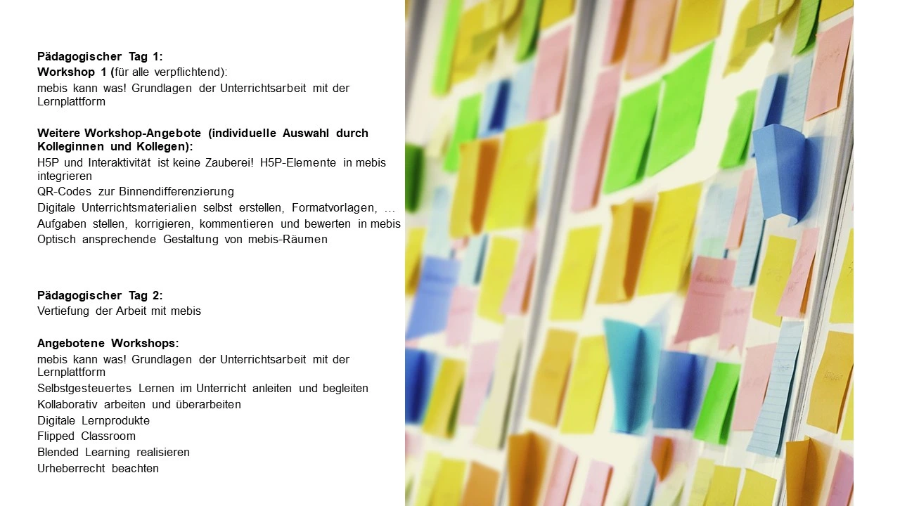 Zum Startpunkt dieser Entwicklung haben wir uns für die Gestaltung zweier pädagogischer Tage entschieden. Die angebotenen Workshops wollen den Kolleginnen und Kollegen mittels einer Vielzahl an Beispielen aus der Praxis für die Praxis Anregungen und Impulse für eine überlegte didaktische Einbindung der Lernplattform mebis an die Hand geben.