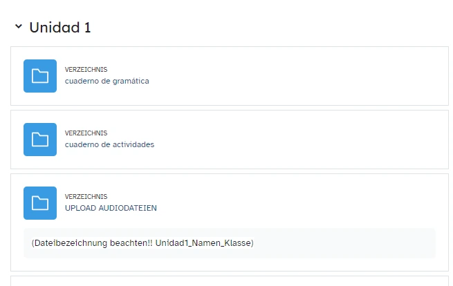 Ein Verzeichnis, in welches auch die Lernenden Dateien hochladen können, z. B. selbst aufgenommene Audiodateien (als differenzierende Aufgabe zu einer Schulbuch-Dialog-Übung)