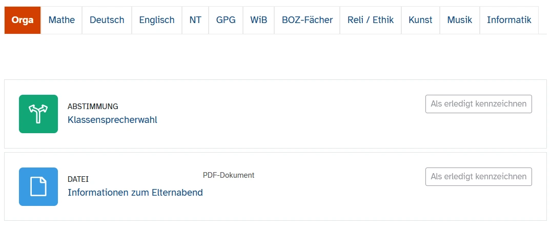 Die gesamten Unterrichtsinhalte werden zeitlich strukturiert abgebildet. Ältere Inhalte sind übersichtlich eingeklappt weiter unten zu finden.