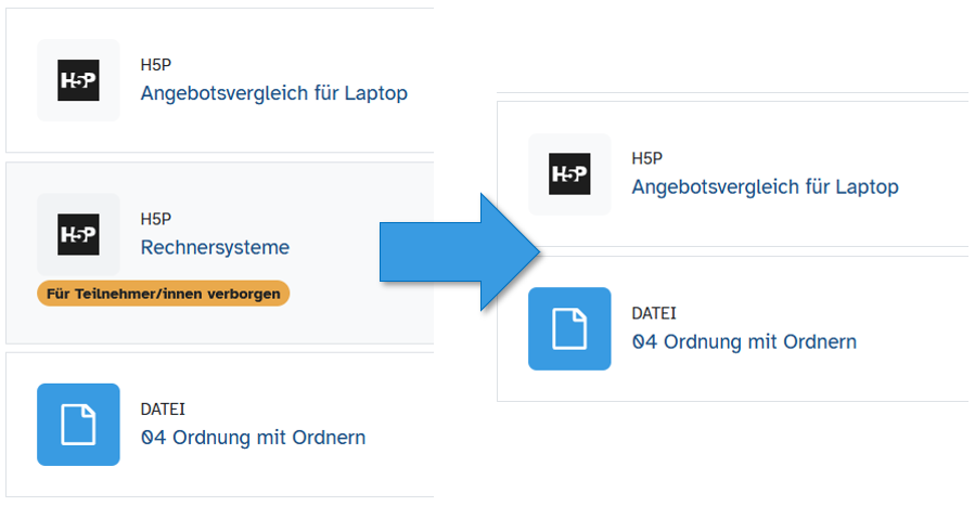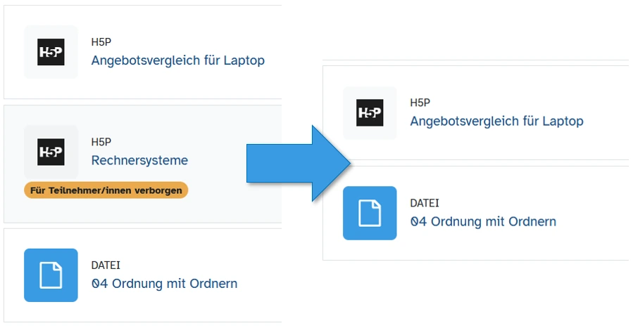 Damit der Kurs nicht zu unübersichtlich wird und das Scrollen zur aktuellen Aktivität nicht zu viel Zeit beansprucht, empfiehlt es sich, diesen gelegentlich „auszumisten“. Bereits bearbeitete Materialien und Aufgaben müssen dabei nicht etwa gelöscht werden. Sie können für Lernende auch ohne Weiteres ausgeblendet werden. So stehen Sie dem Lehrenden weiterhin für das aktuelle Schuljahr bzw. die Durchführung des Kurses in den Folgejahren zur Verfügung und müssen nicht erneut im Kurs integriert werden.