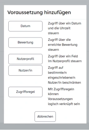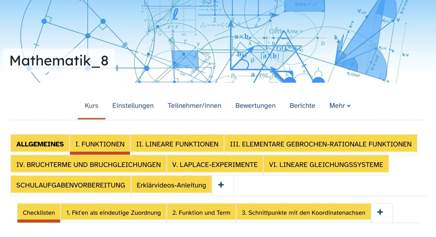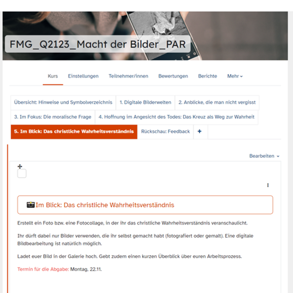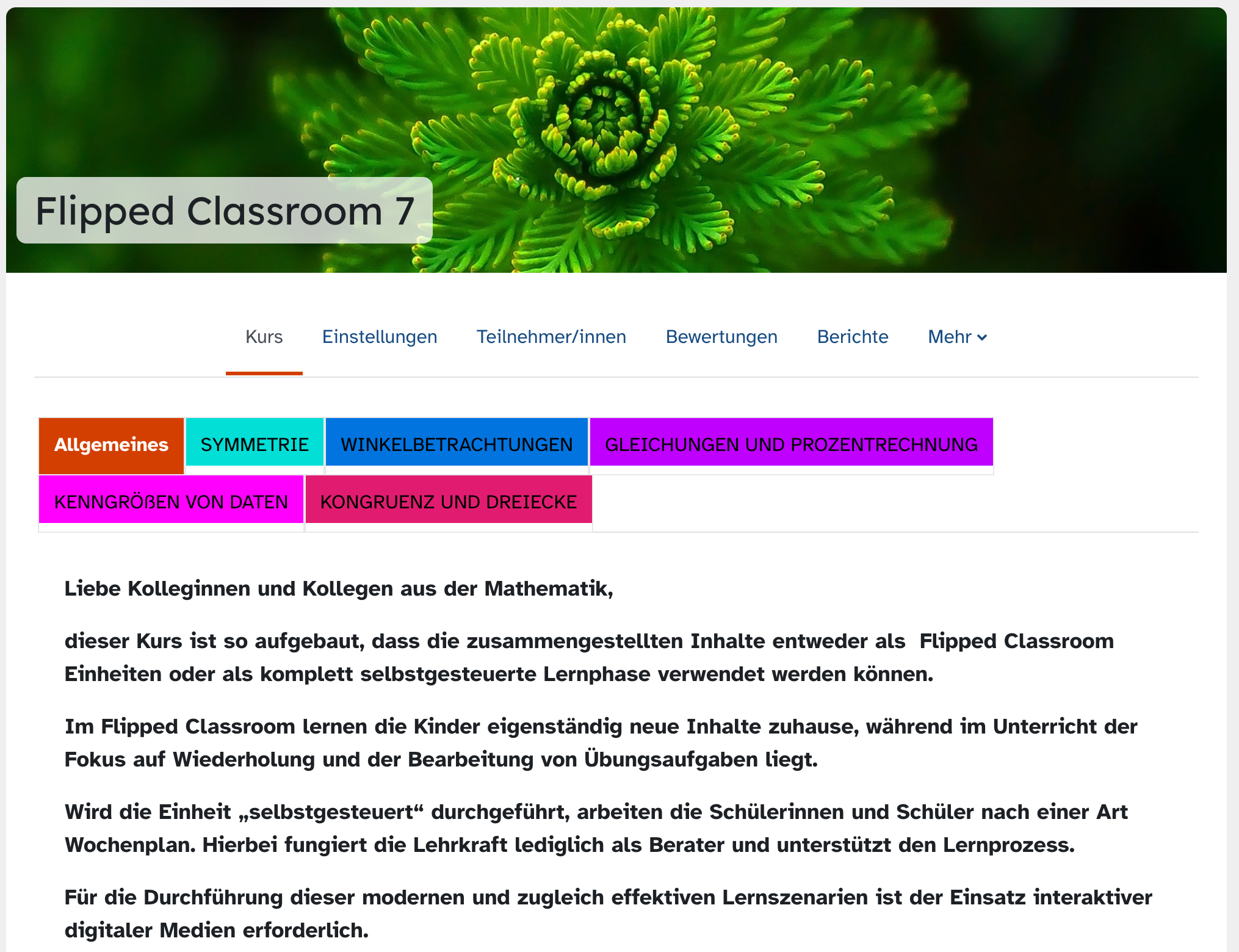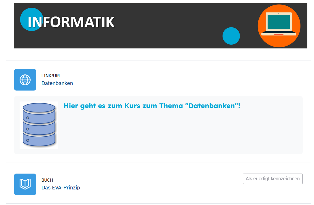 Grundsätzlich sind alle Kursformate möglich. In der Praxis hat sich das Ein-Themen-Format bewährt, um den Lernweg strukturiert und transparent darzustellen und aufeinander aufbauend verschiedene Aspekte des Themas zu veranschaulichen. Dabei kann die Lehrkraft die einzelnen Inhalte sukzessive freigeben und damit gezielt den Lernprozess steuern.