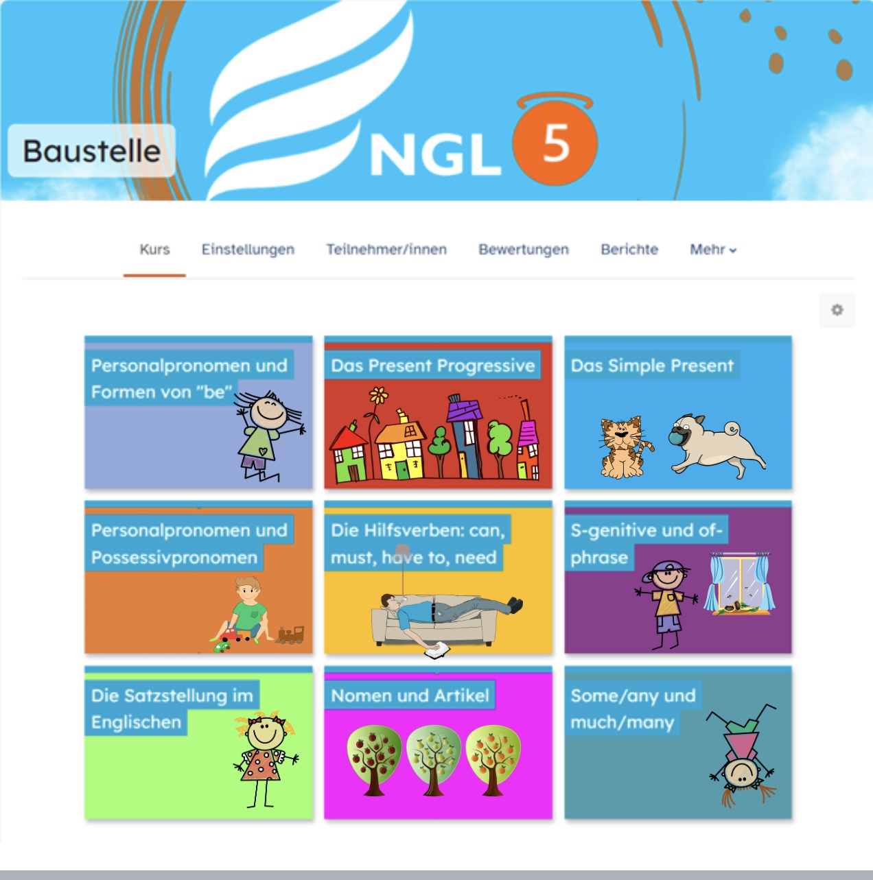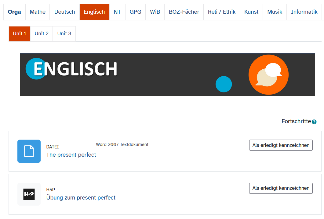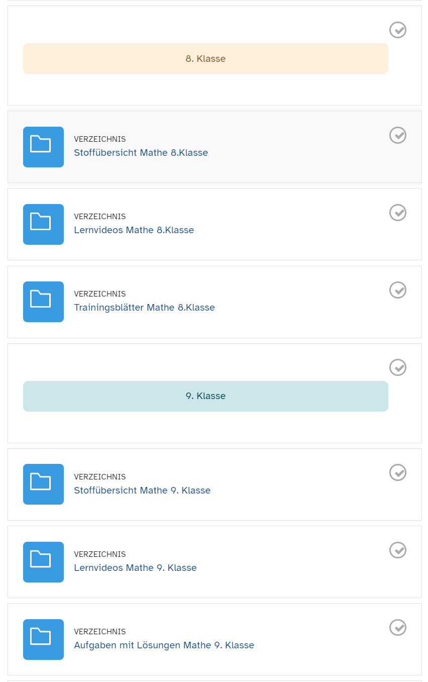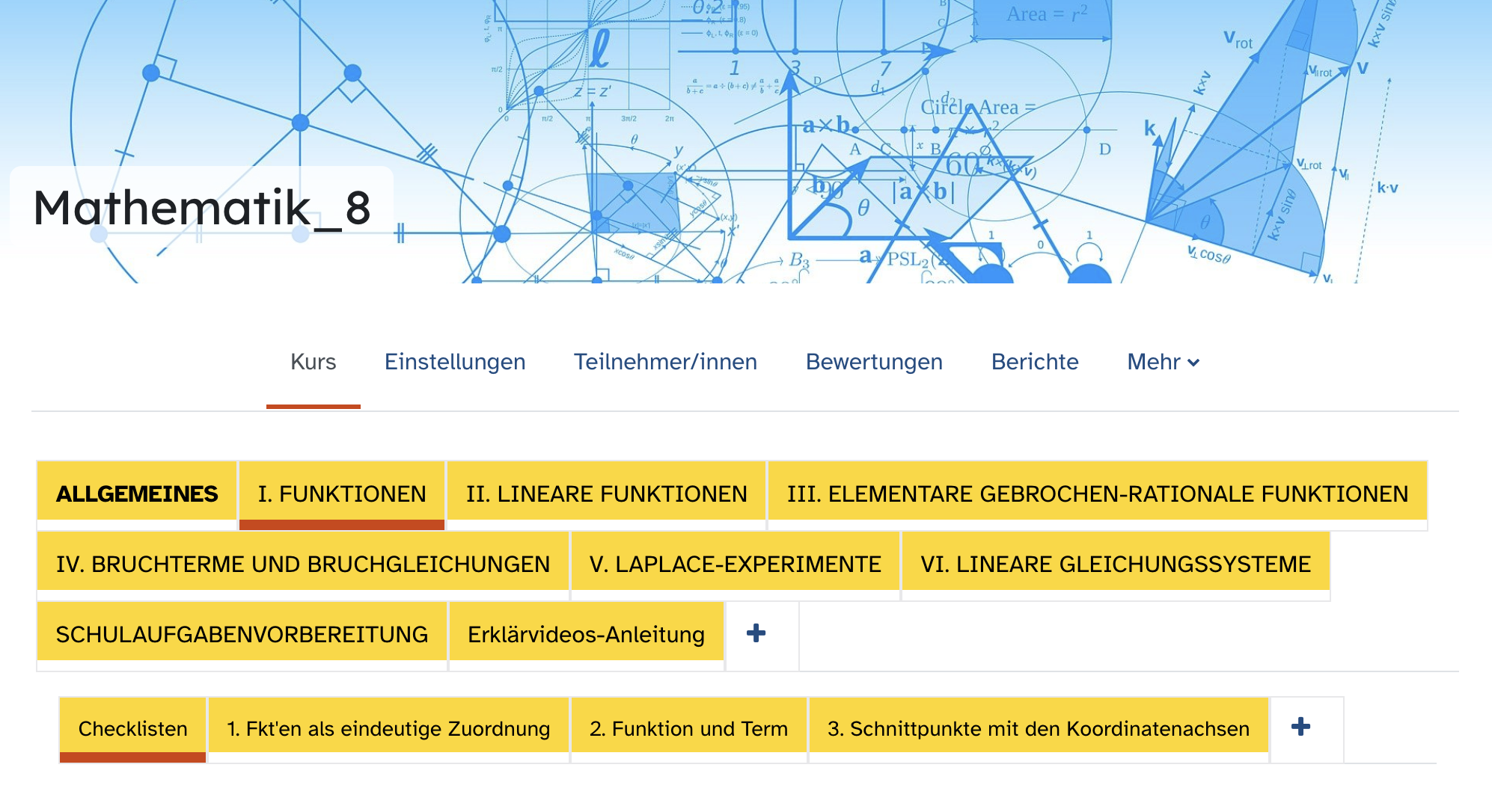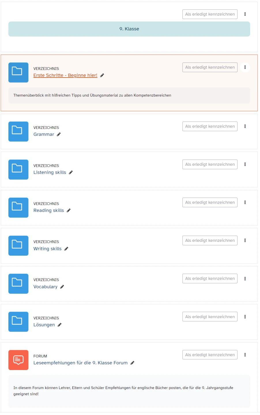 Die Struktur eines Kurses in mebis kann sich auch nach unterschiedlichen Kompetenzerwartungen und Inhalten in einem Fach einer Jahrgangsstufe richten. In diesem Beispiel suchen sich die Lernenden selbstständig denjenigen Inhalt aus, in dem sie sich verbessern möchten.