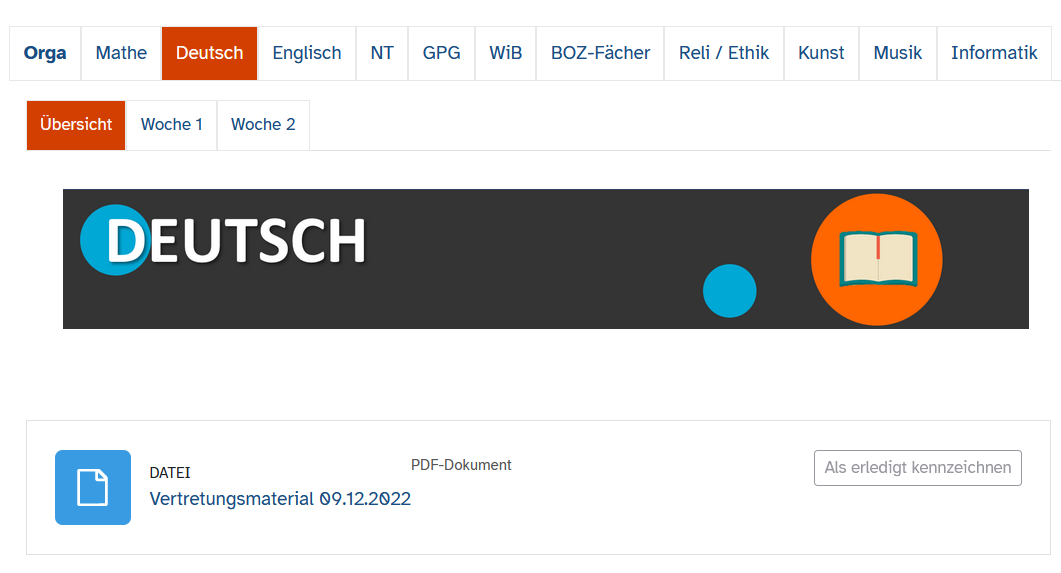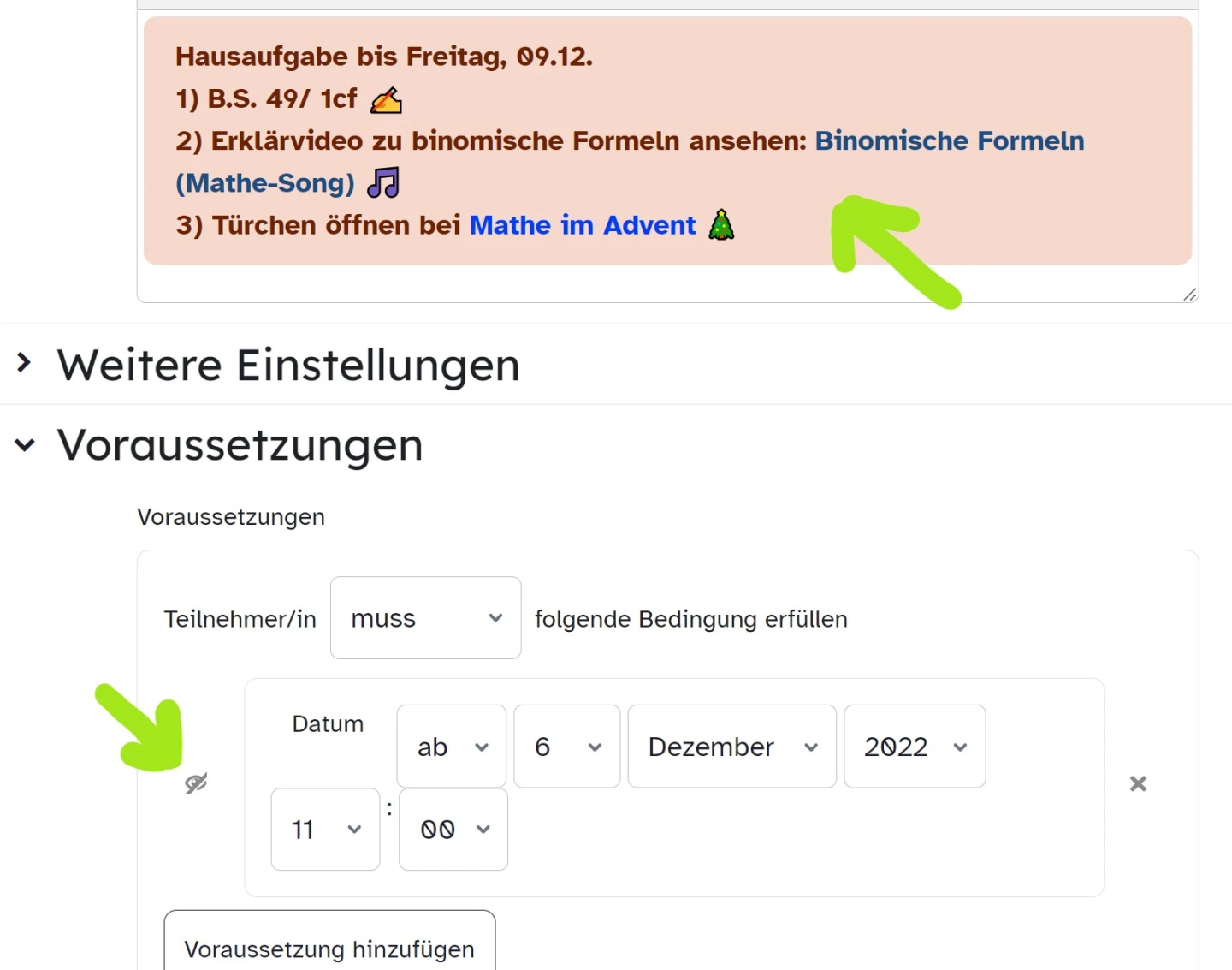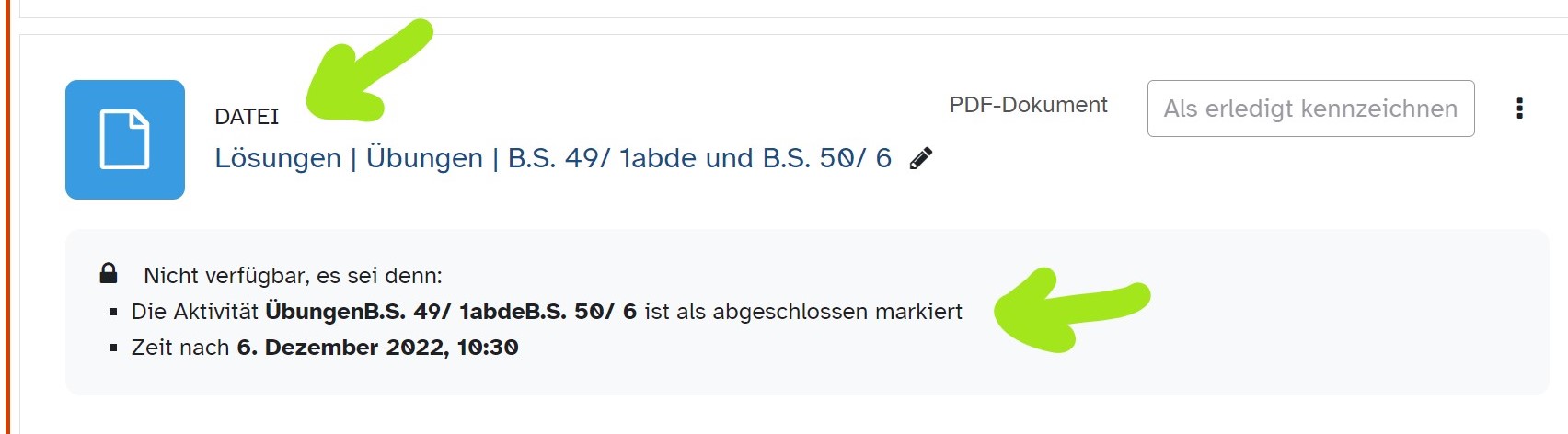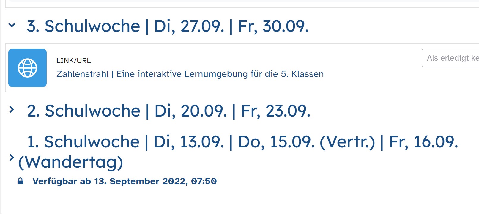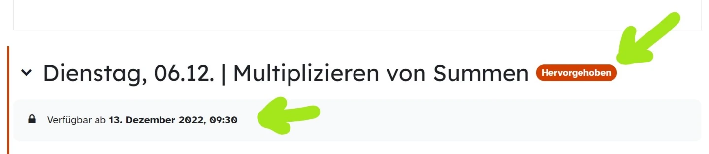 Die Inhalte der aktuellen (Doppel-)Stunde sind mit Wochentag, Datum und Stundenthema beschriftet ganz oben zu finden, um ein zeitaufwändiges Scrollen zu vermeiden. Zudem ist der Abschnitt hervorgehoben, damit er bereits aufgeklappt ist. Die Inhalte des Abschnitts können von den Schülerinnen und Schülern erst mit Stundenbeginn eingesehen werden. Dafür wird die Voraussetzung „Datum“ verwendet.