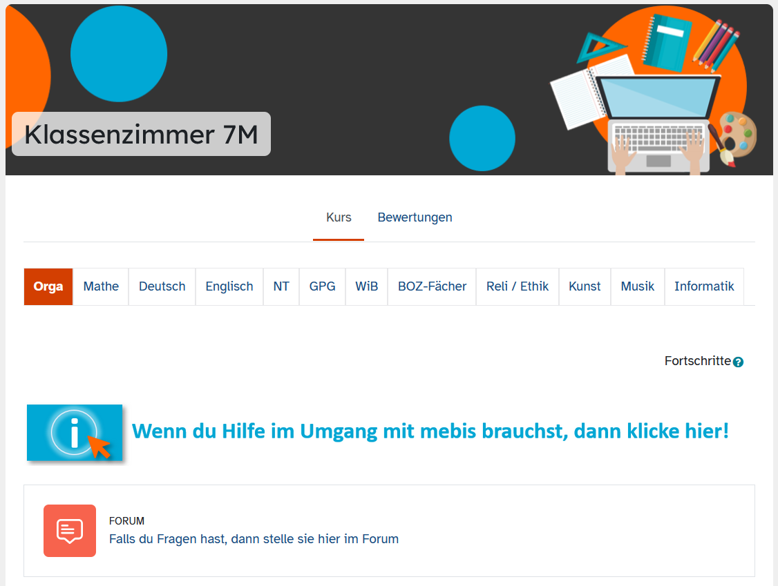Ein Kurs in der mebis Lernplattform kann beispielsweise als virtuelles Klassenzimmer gestaltet werden. Darin sind alle Fächer einer Klasse gemeinsam abgebildet, wobei jedes Fach seinen eigenen Abschnitt erhält. Alle Lehrkräfte, die in dieser Klasse unterrichten, sind in diesen Kurs eingeschrieben und stellen dort ihr Unterrichtsmaterial zur Verfügung.