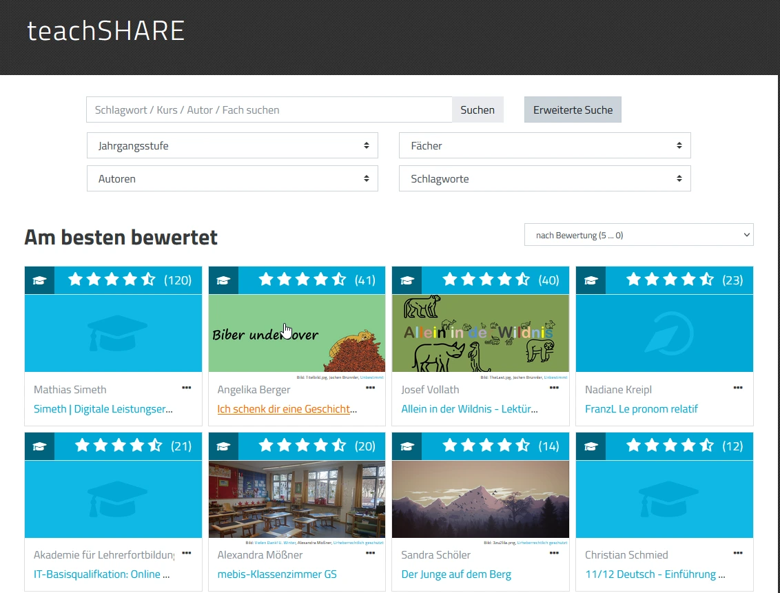 Sie finden aber auch praktisch anwendbare Unterrichtsbeispiele, Musterkurse oder teachSHARE-Kursvorstellungen im Infoportal. Den Link zu den Leseempfehlungen finden Sie in der Sidebar.