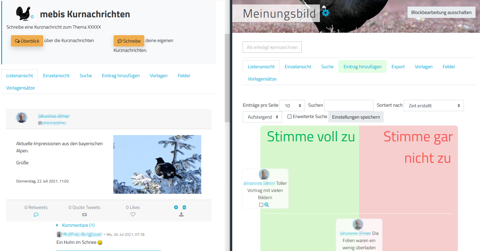 Die Aktivität Datenbank ermöglicht ihnen neben der Sammlung von Dateien auch kreative Lösungen. So finden Sie etwa Vorlagen für ein Stimmungsbild, einen Praktikumsbericht oder einen mebis Kurznachrichtendienst. Eine weitere anspruchsvollere Aktivitäten ist bspw. die gegenseitige Beurteilung, die Sie für einen projektorientieren Unterricht einsetzen können.