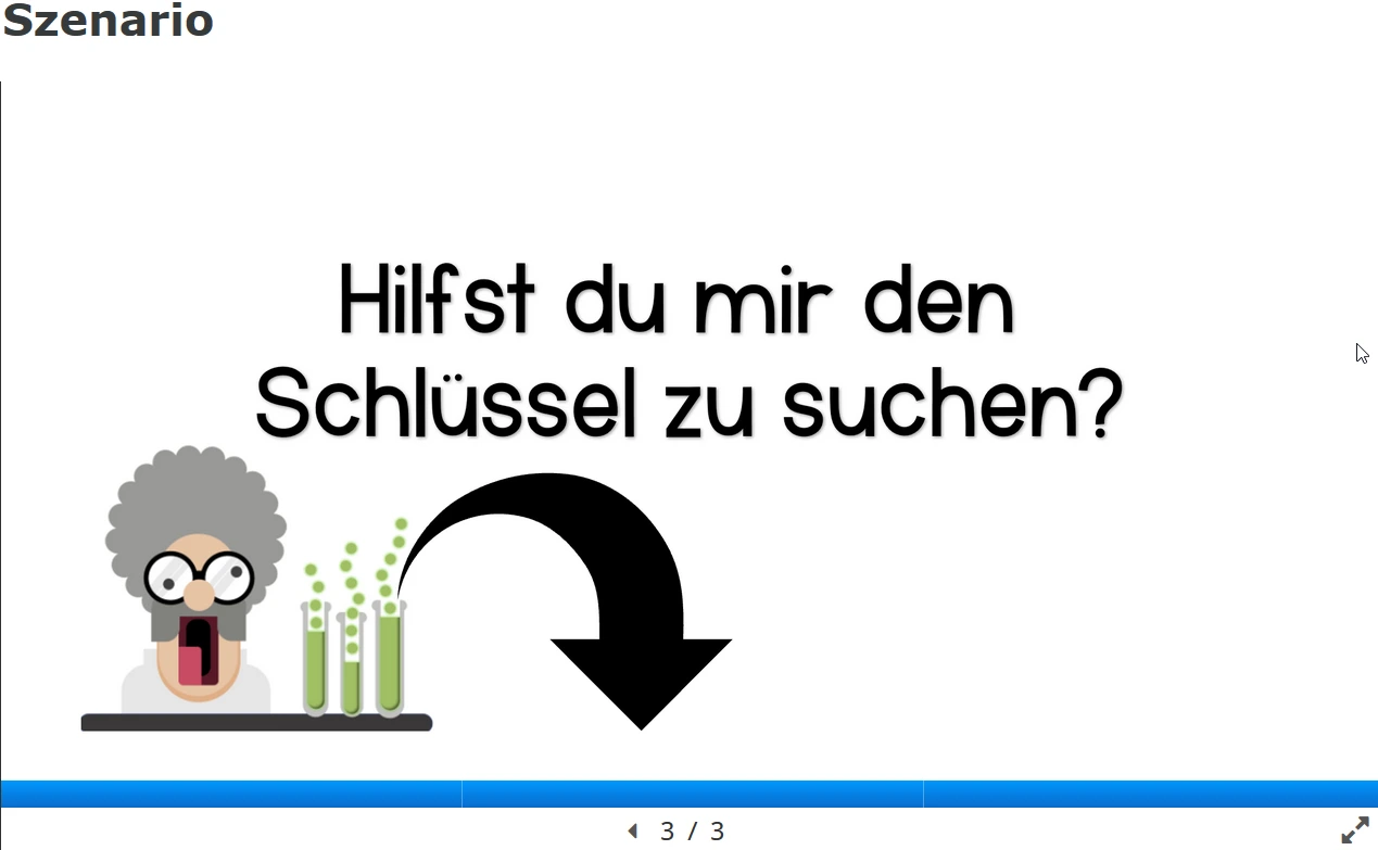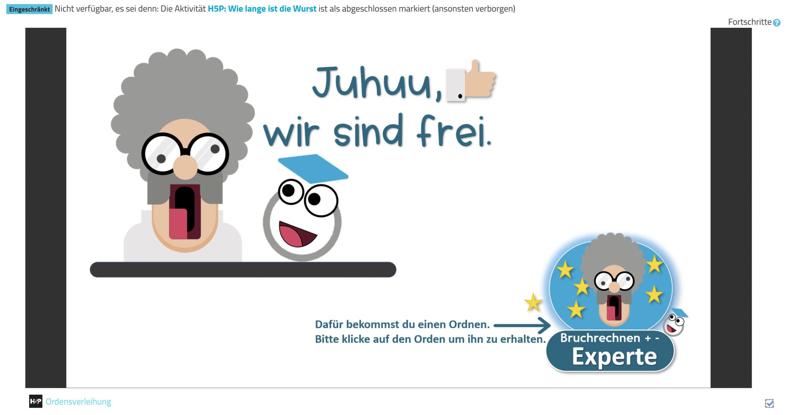 Die Kursteilnehmer bearbeiten dabei schrittweise immer neue Aufgaben. Im Anschluss erhalten sie die benötigten Codes, die in unterschiedlich gestalteten Lösungsfeldern (auf Basis von H5P-Inhalten) eingegeben werden müssen. So arbeitet man sich durch die Rätsel, um am Ende alle Aufgaben gelöst zu haben und den Professor und seinen Assistenten zu befreien.