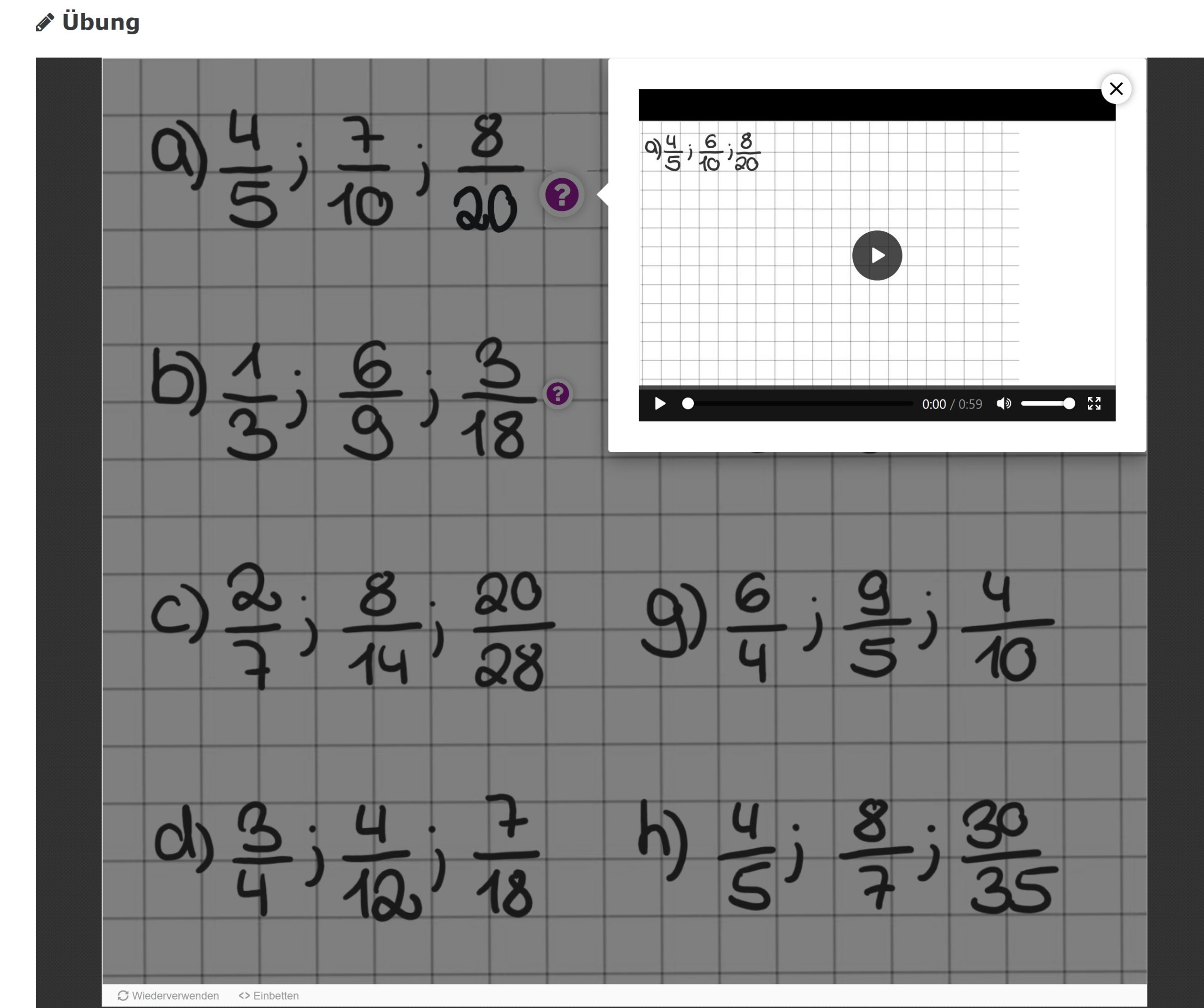 Zur Unterstützung oder als individuelle Hilfe gibt es für jeden der verschiedenen mathematischen Bereiche eine Übungsseite. Diese enthält ein oder mehrere kurze Erklärvideos, in denen das Vorgehen beschrieben wird. Die Erklärvideos sind durch entsprechende Hotspots direkt mit dem entsprechenden Aufgabentyp verbunden.