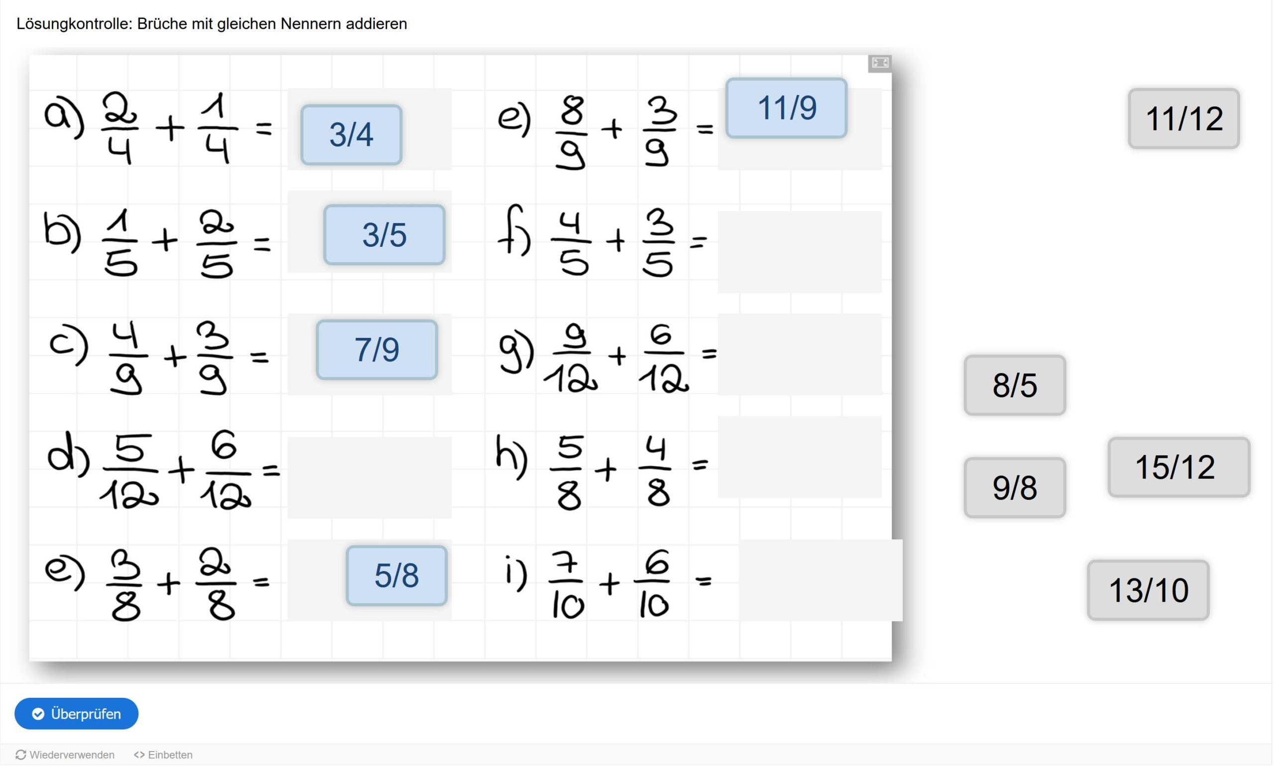 Durch das Bereitstellen vielfältiger Aufgaben wird der Umgang mit Brüchen wiederholt. Dabei geht es sowohl um das Verständnis von Brüchen, das Vergleichen als auch die Addition und Subtraktion.
