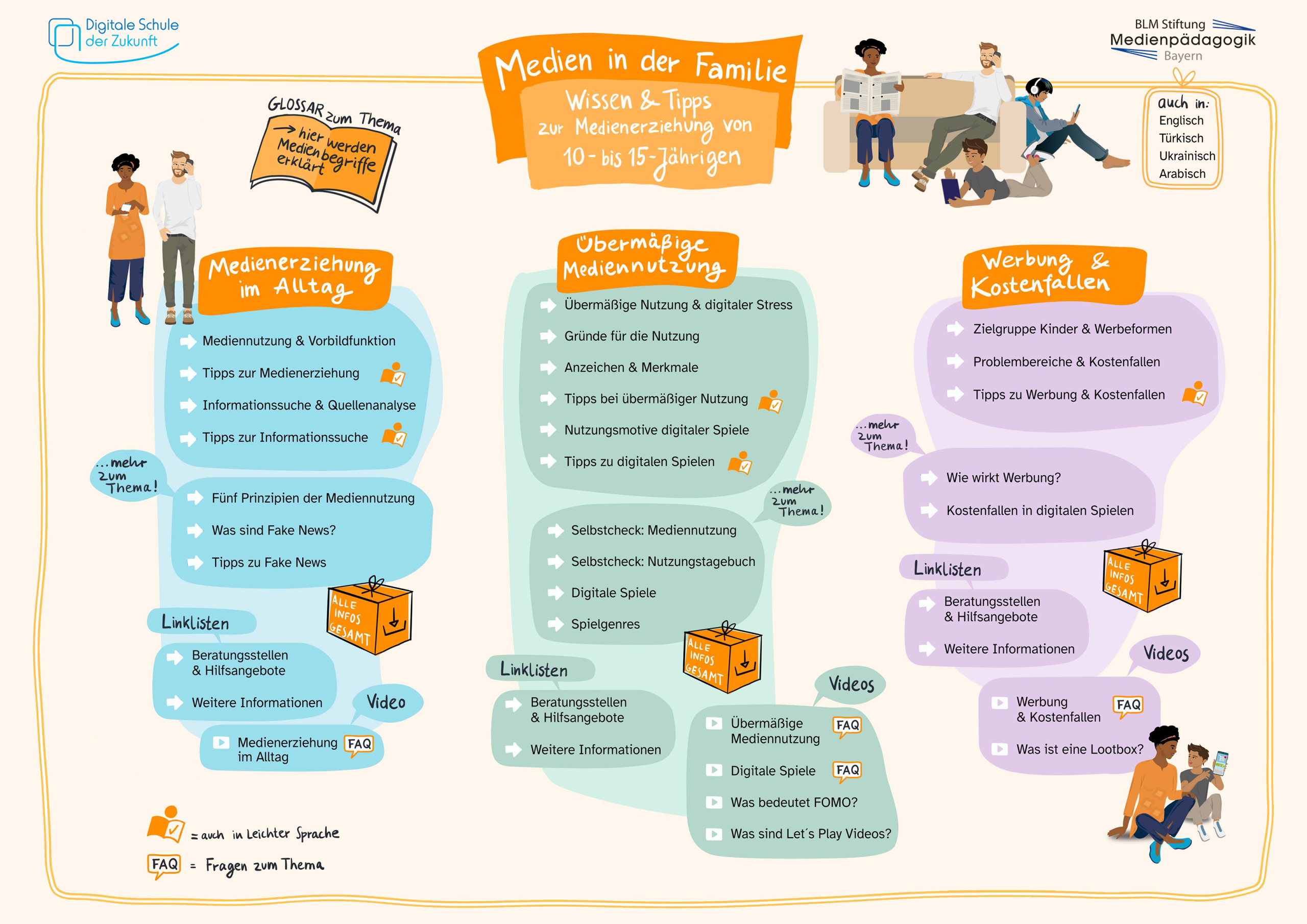 pdf | 6.11 MBJedes Materialpaket enthält grundlegende und weiterführende Informationen sowie praktische Tipps für den Familienalltag, Links zu passenden Online-Angeboten, Beratungsstellen und Hilfsangeboten. Schlüsselbegriffe rund ums Thema „Medien in der Familie” finden Sie im Glossar.