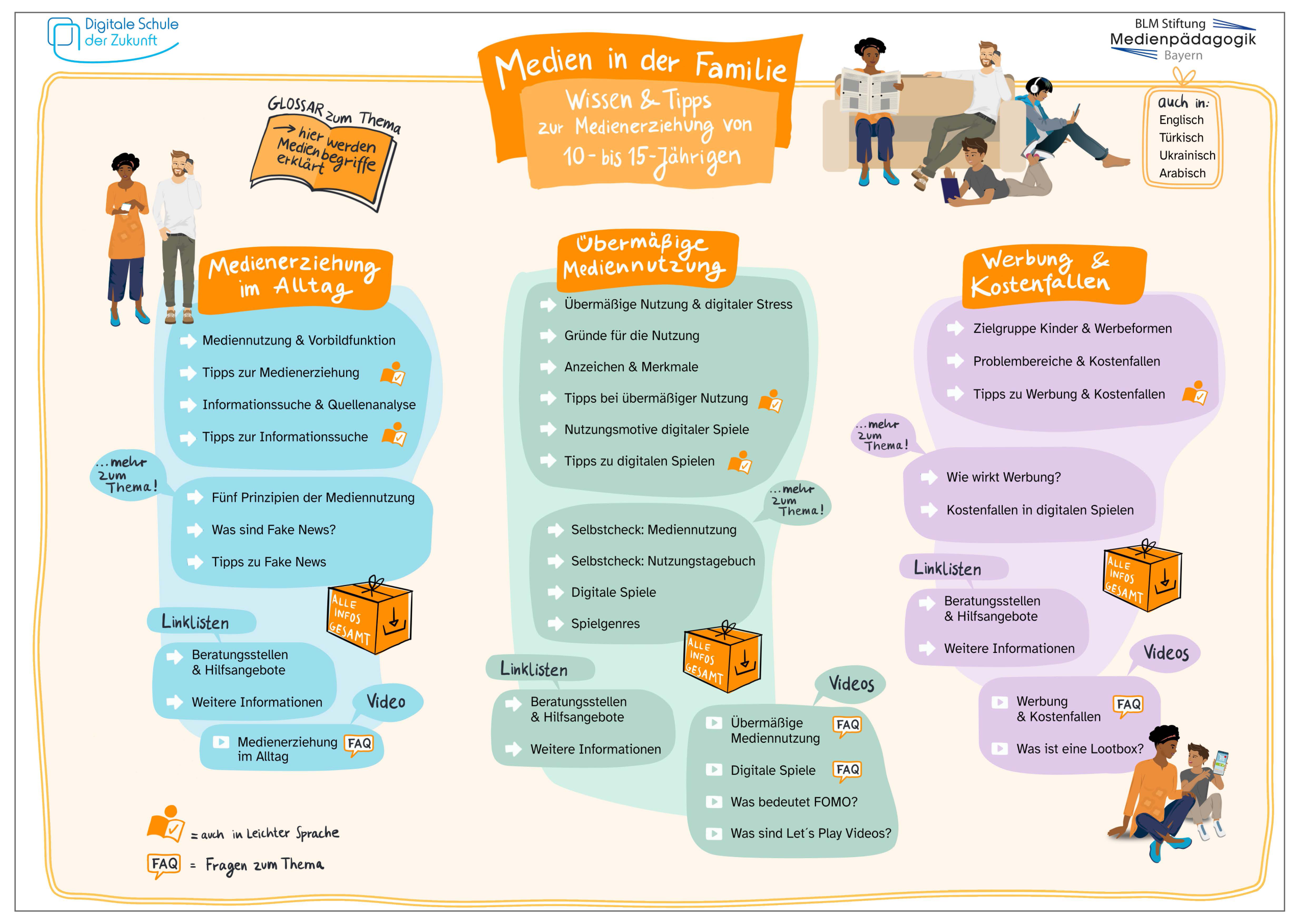 Welche Rolle spielen Medien in meiner Familie? Wie, wozu und wie lange werden sie genutzt? Welchen Stellenwert haben Medien im Alltag? Wenn es um Medienerziehung geht, haben viele Eltern und Erziehungsberechtigte Fragen. Die BLM Stiftung Medienpädagogik Bayern bietet hierfür umfangreiche medienpädagogische Informationsmaterialien sowie FAQ- und Erklärvideos für Eltern.