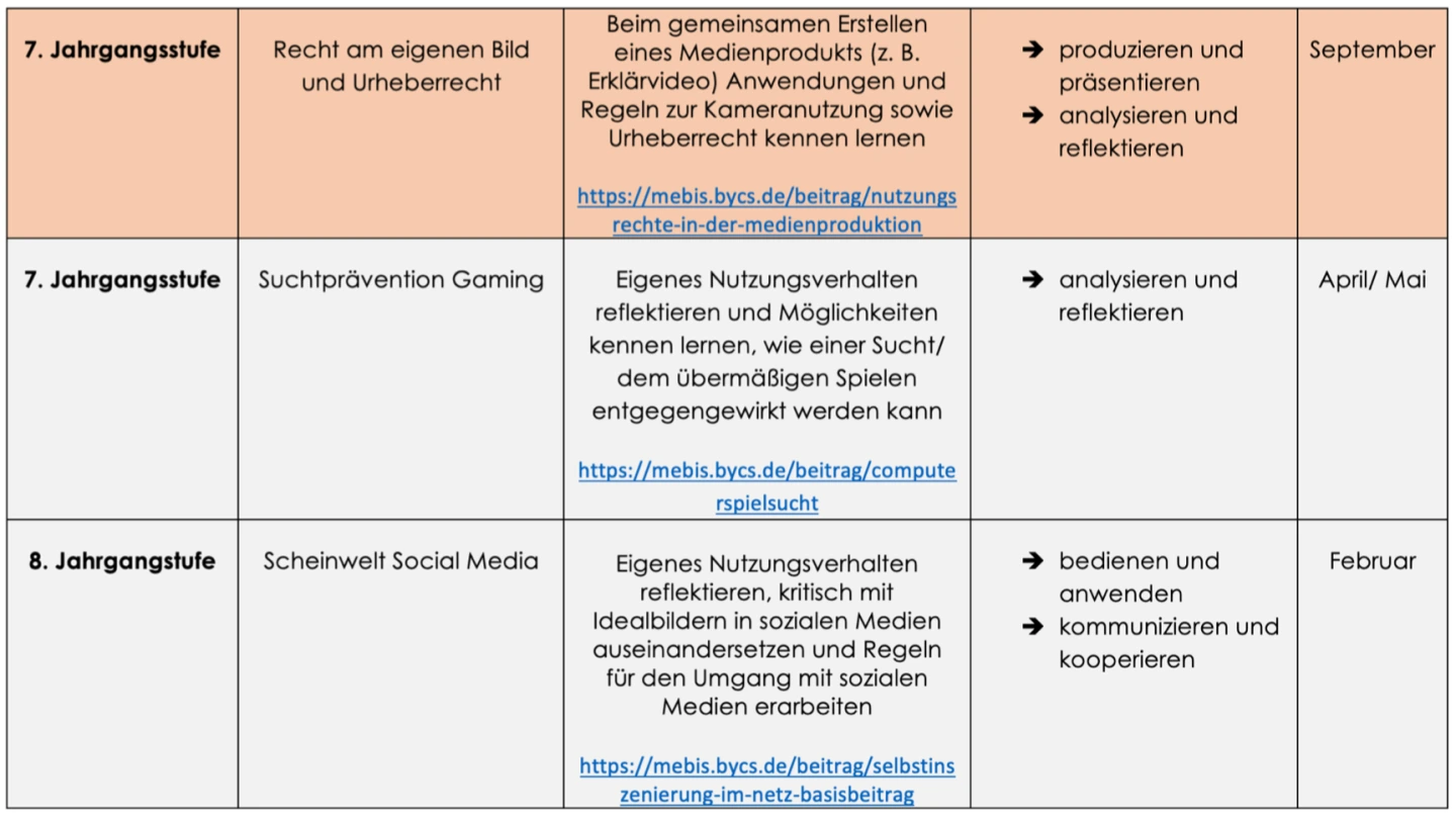 „Wir haben sehr gute Erfahrungen mit dem Einsatz von Medientutorinnen und Medientutoren gemacht. Ab Jahrgangsstufe 9 werden freiwillige Schülerinnen und Schüler zu Netzgängern ausgebildet. In der Unterstufe führen die Netzgänger in Kleingruppen die Module ‚Verzockt?‘, ‚Mein digitales Ich!‘, ‚Bist du sicher?‘ und ‚Resp@kt!‘ durch. Ergänzend führen Lehrkräfte verschiedene Module des Medienführerscheins durch. Diese sind im Mediencurriculum verankert und an Fächer gebunden. Auch hier werden die Netzgänger zur Unterstützung eingesetzt. Jedes Jahr findet ein Elternabend mit einer Referentin des medienpädagogischen Referentennetzwerks statt – letztes Jahr lag der Schwerpunkt in den neu gebildeten Tabletklassen auf Social-Media Angeboten.“