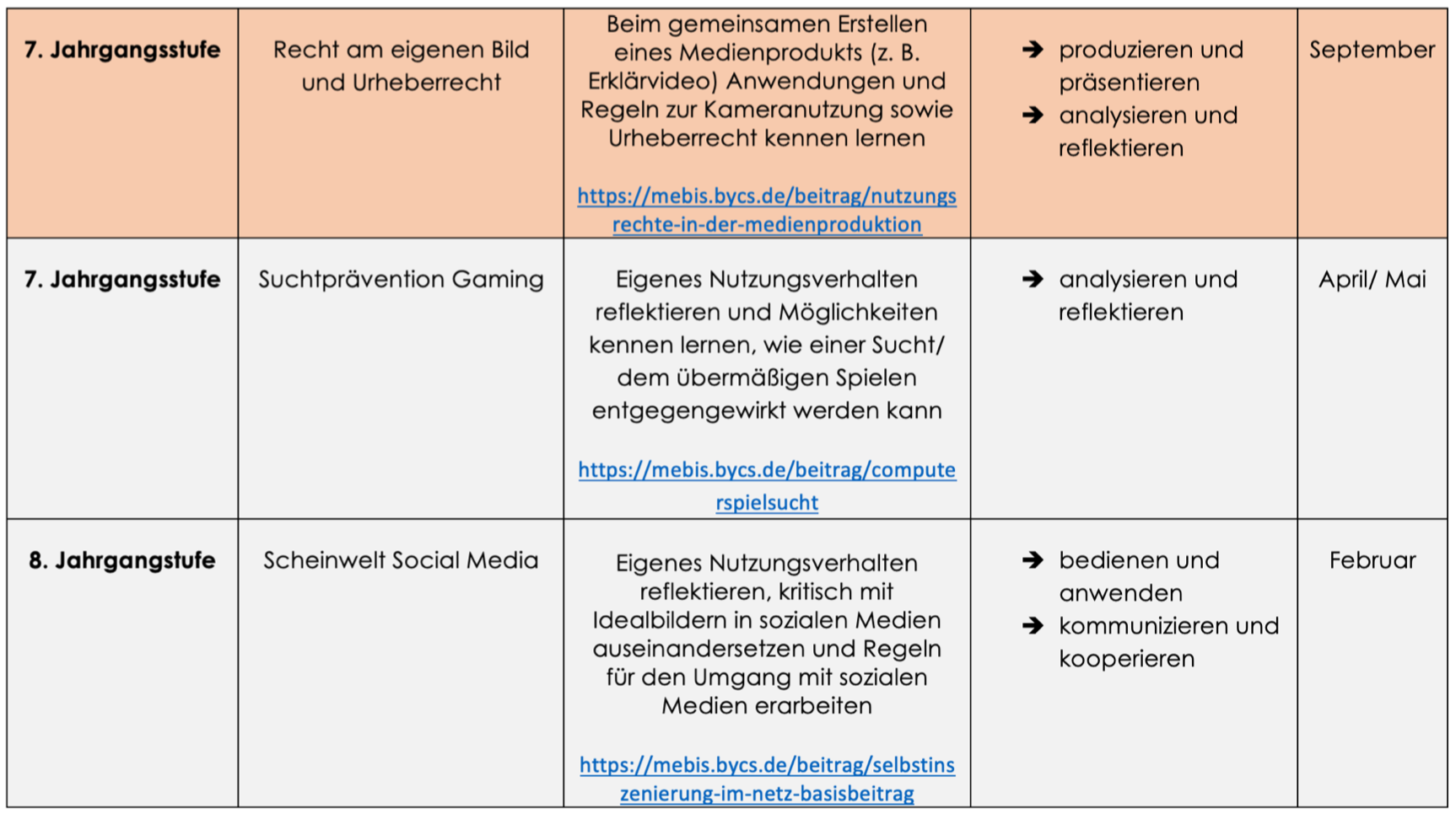 „An unserer Schule wurden bereits vor Einführung der Tabletklassen die Module des Medienführerscheins Bayern in allen Jahrgangsstufen etabliert. Grundlage für die Verteilung der 14 Module ist das Mediencurriculum, in dem das Medienkonzeptteam festgelegt hat, welche Inhalte in der jeweiligen Jahrgangsstufe verbindlich von allen Lehrkräften umgesetzt werden sollen. Diese bilden zumindest den Grundkonsens einer kontinuierlichen und aufeinander abgestimmten Medienerziehung an unserer Schule. Mit der Einführung der Tabletklassen haben wir einzelne Inhalte nochmals angepasst. Darüber hinaus findet in den einzelnen Fächern integrative Medienarbeit statt, in denen Themen wie Urheberrecht und Datenschutz eine Rolle spielen.“